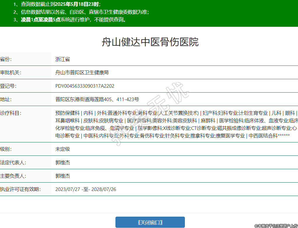 省份:浙江省審批機(jī)關(guān):舟山市普陀區(qū)衛(wèi)生健康局登記號(hào):PDY00456333090317A2202地址:普陀區(qū)東港街道海蓮路405、411-423號(hào)診療科目:預(yù)防保健科 | 內(nèi)科 | 外科;普通外科專業(yè);骨科專業(yè)(人工關(guān)節(jié)置換技術(shù)) | 婦產(chǎn)科;婦科專業(yè);計(jì)劃生育專業(yè) | 兒科 | 眼科 | 耳鼻咽喉科 | 皮膚科;皮膚病專業(yè) | 醫(yī)療美容科;美容外科;美容皮膚科 | 麻醉科 | 醫(yī)學(xué)檢驗(yàn)科;臨床體液、血液專業(yè);臨床化學(xué)檢驗(yàn)專業(yè);臨床免疫、血清學(xué)專業(yè) | 醫(yī)學(xué)影像科;X線診斷專業(yè);CT診斷專業(yè);磁共振成像診斷專業(yè);超聲診斷專業(yè);心電診斷專業(yè) | 中醫(yī)科;內(nèi)科專業(yè);外科專業(yè);骨傷科專業(yè);針灸科專業(yè);推拿科專業(yè);康復(fù)醫(yī)學(xué)專業(yè) | 中西醫(yī)結(jié)合科******級(jí)別:未定級(jí)法定代表人:郭維杰主要負(fù)責(zé)人:郭維杰執(zhí)業(yè)許可證有效期:2023/07/27 -至- 2028/07/26 -