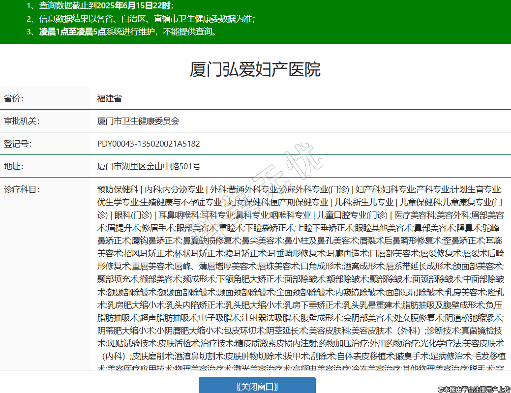 省份:福建省審批機(jī)關(guān):廈門(mén)市衛(wèi)生健康委員會(huì)登記號(hào):PDY00043-135020021A5182地址:廈門(mén)市湖里區(qū)金山中路501號(hào)診療科目:預(yù)防保健科 | 內(nèi)科;內(nèi)分泌專(zhuān)業(yè) | 外科;普通外科專(zhuān)業(yè);泌尿外科專(zhuān)業(yè)(門(mén)診) | 婦產(chǎn)科;婦科專(zhuān)業(yè);產(chǎn)科專(zhuān)業(yè);計(jì)劃生育專(zhuān)業(yè);優(yōu)生學(xué)專(zhuān)業(yè);生殖健康與不孕癥專(zhuān)業(yè) | 婦女保健科;圍產(chǎn)期保健專(zhuān)業(yè) | 兒科;新生兒專(zhuān)業(yè) | 兒童保健科;兒童康復(fù)專(zhuān)業(yè)(門(mén)診) | 眼科(門(mén)診) | 耳鼻咽喉科;耳科專(zhuān)業(yè);鼻科專(zhuān)業(yè);咽喉科專(zhuān)業(yè) | 兒童口腔專(zhuān)業(yè)(門(mén)診) | 醫(yī)療美容科;美容外科;眉部美容術(shù);眉提升術(shù);修眉手術(shù);眼部美容術(shù);重瞼術(shù);下瞼袋矯正術(shù);上瞼下垂矯正術(shù);眼瞼其他美容術(shù);鼻部美容術(shù);隆鼻術(shù);駝峰鼻矯正術(shù);鷹鉤鼻矯正術(shù);鼻翼缺損修復(fù)術(shù);鼻尖美容術(shù);鼻小柱及鼻孔美容術(shù);唇裂術(shù)后鼻畸形修復(fù)術(shù);歪鼻矯正術(shù);耳廓美容術(shù);招風(fēng)耳矯正術(shù);杯狀耳矯正術(shù);隱耳矯正術(shù);耳垂畸形修復(fù)術(shù);耳廓再造術(shù);口唇部美容術(shù);唇裂修復(fù)術(shù);唇裂術(shù)后畸形修復(fù)術(shù);重唇美容術(shù);唇峰、薄唇增厚美容術(shù);唇珠美容術(shù);口角成形術(shù);酒窩成形術(shù);唇系帶延長(zhǎng)成形術(shù);頜面部美容術(shù);顳部填充術(shù);顴部美容術(shù);頦成形術(shù);下頜角肥大矯正術(shù);面部除皺術(shù);額部除皺術(shù);顳部除皺術(shù);面頸部除皺術(shù);中面部除皺術(shù);額顳部除皺術(shù);額顳面部除皺術(shù);顳面頸部除皺術(shù);全面頸部除皺術(shù);內(nèi)窺鏡除皺術(shù);面部懸吊除皺術(shù);乳房美容術(shù);隆乳術(shù);乳房肥大縮小術(shù);乳頭內(nèi)陷矯正術(shù);乳頭肥大縮小術(shù);乳房下垂矯正術(shù);乳頭乳暈重建術(shù);脂肪抽吸及腹壁成形術(shù);負(fù)壓脂肪抽吸術(shù);超聲脂肪抽吸術(shù);電子吸脂術(shù);注射器法吸脂術(shù);腹壁成形術(shù);會(huì)陰部美容術(shù);處女膜修復(fù)術(shù);陰道松弛縮緊術(shù);陰蒂肥大縮小術(shù);小陰唇肥大縮小術(shù);包皮環(huán)切術(shù);陰莖延長(zhǎng)術(shù);美容皮膚科;美容皮膚術(shù)(外科);診斷技術(shù);真菌鏡檢技術(shù);斑貼試驗(yàn)技術(shù);皮膚活檢術(shù);治療技術(shù);糖皮質(zhì)激素皮損內(nèi)注射;藥物加壓治療;外用藥物治療;光化學(xué)療法;美容皮膚術(shù)(內(nèi)科);皮膚磨削術(shù);酒渣鼻切割術(shù);皮膚腫物切除術(shù);拔甲術(shù);刮除術(shù);自體表皮移植術(shù);腋臭手術(shù);足病修治術(shù);毛發(fā)移植術(shù);美容醫(yī)療應(yīng)用技術(shù);物理美容治療術(shù);激光美容治療術(shù);高頻電美容治療;冷凍美容治療;其他物理美容治療;脫毛術(shù);穿耳孔術(shù);注射美容技術(shù);A型肉毒毒素美容注射技術(shù);皮膚(軟組織)注射(填充)美容;美容文飾技術(shù);文眉技術(shù);文眼線技術(shù);文唇技術(shù);不良文飾修復(fù)技術(shù) | 急診醫(yī)學(xué)科 | 麻醉科 | 醫(yī)學(xué)檢驗(yàn)科;臨床體液、血液專(zhuān)業(yè);臨床微生物學(xué)專(zhuān)業(yè);臨床化學(xué)檢驗(yàn)專(zhuān)業(yè);臨床免疫、血清學(xué)專(zhuān)業(yè);臨床細(xì)胞分子遺傳學(xué)專(zhuān)業(yè)(協(xié)議) | 病理科(協(xié)議) | 醫(yī)學(xué)影像科;X線診斷專(zhuān)業(yè);CT診斷專(zhuān)業(yè);磁共振成像診斷專(zhuān)業(yè);超聲診斷專(zhuān)業(yè);心電診斷專(zhuān)業(yè)(協(xié)議) | 中醫(yī)科;婦產(chǎn)科專(zhuān)業(yè) | 中西醫(yī)結(jié)合科******級(jí)別:三級(jí)法定代表人:徐偉主要負(fù)責(zé)人:邱娜璇執(zhí)業(yè)許可證有效期:2025/01/10 -至- 2027/07/20 -