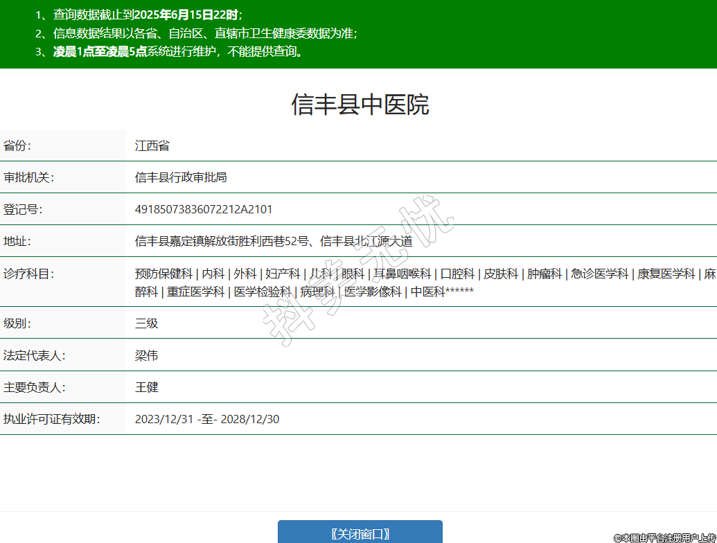 省份:江西省審批機(jī)關(guān):信豐縣行政審批局登記號(hào):49185073836072212A2101地址:信豐縣嘉定鎮(zhèn)解放街勝利西巷52號(hào)、信豐縣北江源大道診療科目:預(yù)防保健科 | 內(nèi)科 | 外科 | 婦產(chǎn)科 | 兒科 | 眼科 | 耳鼻咽喉科 | 口腔科 | 皮膚科 | 腫瘤科 | 急診醫(yī)學(xué)科 | 康復(fù)醫(yī)學(xué)科 | 麻醉科 | 重癥醫(yī)學(xué)科 | 醫(yī)學(xué)檢驗(yàn)科 | 病理科 | 醫(yī)學(xué)影像科 | 中醫(yī)科******級(jí)別:三級(jí)法定代表人:梁偉主要負(fù)責(zé)人:王健執(zhí)業(yè)許可證有效期:2023/12/31 -至- 2028/12/30 -