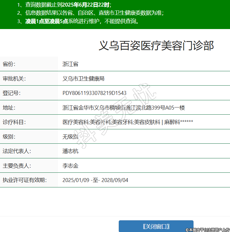 省份:浙江省審批機關(guān):義烏市衛(wèi)生健康局登記號:PDY80611933078219D1543地址:浙江省金華市義烏市稠城街道江濱北路399號A05一樓診療科目:醫(yī)療美容科;美容外科;美容牙科;美容皮膚科 | 麻醉科******級別:無級別法定代表人:潘志杭主要負責人:李志金執(zhí)業(yè)許可證有效期:2025/01/09 -至- 2028/09/04 -