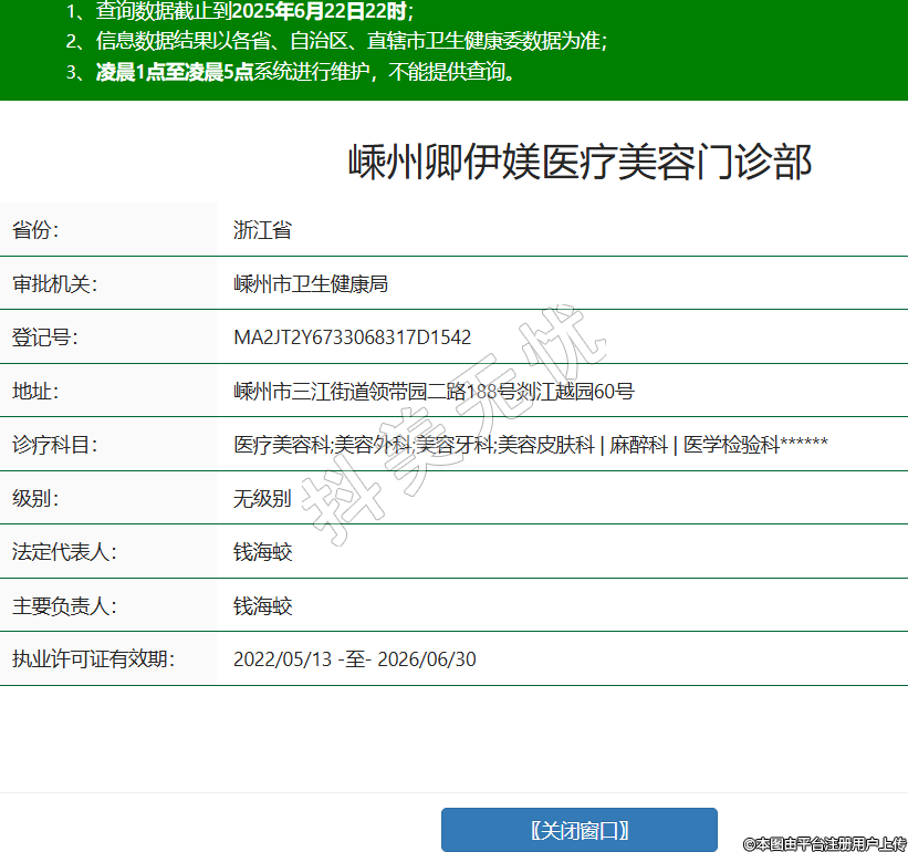 省份:浙江省審批機(jī)關(guān):嵊州市衛(wèi)生健康局登記號:MA2JT2Y6733068317D1542地址:嵊州市三江街道領(lǐng)帶園二路188號剡江越園60號診療科目:醫(yī)療美容科;美容外科;美容牙科;美容皮膚科 | 麻醉科 | 醫(yī)學(xué)檢驗(yàn)科******級別:無級別法定代表人:錢海蛟主要負(fù)責(zé)人:錢海蛟執(zhí)業(yè)許可證有效期:2022/05/13 -至- 2026/06/30 -