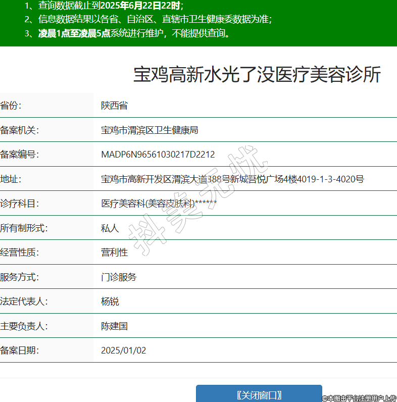 省份:陜西省備案機關(guān):寶雞市渭濱區(qū)衛(wèi)生健康局備案編號:MADP6N96561030217D2212地址:寶雞市高新開發(fā)區(qū)渭濱大道388號新城吾悅廣場4樓4019-1-3-4020號診療科目:醫(yī)療美容科(美容皮膚科)******所有制形式:私人經(jīng)營性質(zhì):營利性服務(wù)方式:門診服務(wù)法定代表人:楊銳主要負(fù)責(zé)人:陳建國備案日期:2025/01/02 -