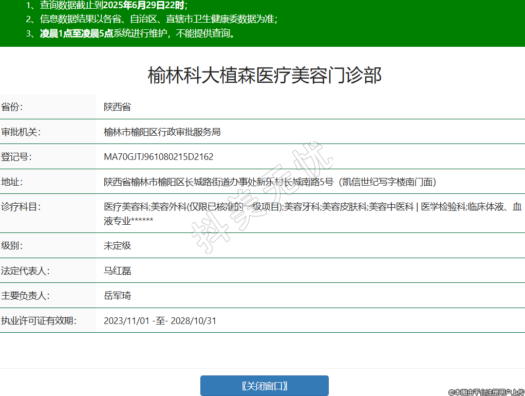 省份:陜西省審批機關(guān):榆林市榆陽區(qū)行政審批服務(wù)局登記號:MA70GJTJ961080215D2162地址:陜西省榆林市榆陽區(qū)長城路街道辦事處新樂村長城南路5號(凱信世紀寫字樓南門面)診療科目:醫(yī)療美容科;美容外科(僅限已核準的一級項目);美容牙科;美容皮膚科;美容中醫(yī)科 | 醫(yī)學(xué)檢驗科;臨床體液、血液專業(yè)******級別:未定級法定代表人:馬紅磊主要負責(zé)人:岳軍琦執(zhí)業(yè)許可證有效期:2023/11/01 -至- 2028/10/31 -