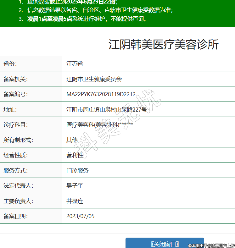 省份:江蘇省備案機(jī)關(guān):江陰市衛(wèi)生健康委員會(huì)備案編號(hào):MA22PYK7632028119D2212地址:江陰市周莊鎮(zhèn)山泉村山泉路227號(hào)診療科目:醫(yī)療美容科(美容外科)******所有制形式:其他經(jīng)營性質(zhì):營利性服務(wù)方式:門診服務(wù)法定代表人:吳子奎主要負(fù)責(zé)人:井顯連備案日期:2023/07/05 -