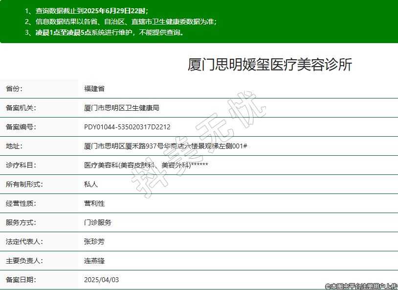 省份:福建省備案機(jī)關(guān):廈門市思明區(qū)衛(wèi)生健康局備案編號(hào):PDY01044-535020317D2212地址:廈門市思明區(qū)廈禾路937號(hào)華商店六樓景觀梯左側(cè)001#診療科目:醫(yī)療美容科(美容皮膚科、美容外科)******所有制形式:私人經(jīng)營(yíng)性質(zhì):營(yíng)利性服務(wù)方式:門診服務(wù)法定代表人:張珍芳主要負(fù)責(zé)人:連燕鋒備案日期:2025/04/03 -