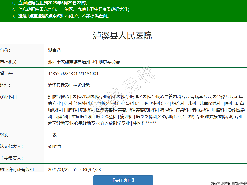 省份:湖南省審批機(jī)關(guān):湘西土家族苗族自治州衛(wèi)生健康委員會(huì)登記號(hào):44855592843312211A1001地址:瀘溪縣武溪鎮(zhèn)建設(shè)北路診療科目:預(yù)防保健科 | 內(nèi)科;呼吸內(nèi)科專業(yè);消化內(nèi)科專業(yè);神經(jīng)內(nèi)科專業(yè);心血管內(nèi)科專業(yè);腎病學(xué)專業(yè);內(nèi)分泌專業(yè);老年病專業(yè) | 外科;普通外科專業(yè);神經(jīng)外科專業(yè);骨科專業(yè);泌尿外科專業(yè) | 婦產(chǎn)科 | 兒科 | 兒童保健科 | 眼科 | 耳鼻咽喉科 | 口腔科 | 皮膚科 | 醫(yī)療美容科;美容牙科;美容皮膚科 | 精神科 | 傳染科 | 結(jié)核病科 | 腫瘤科 | 急診醫(yī)學(xué)科 | 麻醉科 | 重癥醫(yī)學(xué)科 | 醫(yī)學(xué)檢驗(yàn)科 | 病理科 | 醫(yī)學(xué)影像科;X線診斷專業(yè);CT診斷專業(yè);磁共振成像診斷專業(yè);超聲診斷專業(yè);心電診斷專業(yè);介入放射學(xué)專業(yè) | 中醫(yī)科******級(jí)別:二級(jí)法定代表人:楊明清主要負(fù)責(zé)人:執(zhí)業(yè)許可證有效期:2021/04/29 -至- 2036/04/28 -