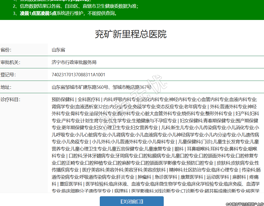 省份:山東省審批機(jī)關(guān):濟(jì)寧市行政審批服務(wù)局登記號:74023170137088311A1001地址:山東省鄒城市礦建東路560號、鄒城市鮑店路367號診療科目:預(yù)防保健科 | 全科醫(yī)療科 | 內(nèi)科;呼吸內(nèi)科專業(yè);消化內(nèi)科專業(yè);神經(jīng)內(nèi)科專業(yè);心血管內(nèi)科專業(yè);血液內(nèi)科專業(yè);腎病學(xué)專業(yè)(血液透析室32臺);內(nèi)分泌專業(yè);免疫學(xué)專業(yè);變態(tài)反應(yīng)專業(yè);老年病專業(yè) | 外科;普通外科專業(yè);神經(jīng)外科專業(yè);骨科專業(yè);泌尿外科專業(yè);胸外科專業(yè);心臟大血管外科專業(yè);燒傷科專業(yè);整形外科專業(yè) | 婦產(chǎn)科;婦科專業(yè);產(chǎn)科專業(yè);計劃生育專業(yè);優(yōu)生學(xué)專業(yè);生殖健康與不孕癥專業(yè) | 婦女保健科;青春期保健專業(yè);圍產(chǎn)期保健專業(yè);更年期保健專業(yè);婦女心理衛(wèi)生專業(yè);婦女營養(yǎng)專業(yè) | 兒科;新生兒專業(yè);小兒傳染病專業(yè);小兒消化專業(yè);小兒呼吸專業(yè);小兒心臟病專業(yè);小兒腎病專業(yè);小兒血液病專業(yè);小兒神經(jīng)病學(xué)專業(yè);小兒內(nèi)分泌專業(yè);小兒遺傳病專業(yè);小兒免疫專業(yè) | 小兒外科;小兒普通外科專業(yè);小兒骨科專業(yè) | 兒童保健科(門診);兒童生長發(fā)育專業(yè);兒童營養(yǎng)專業(yè);兒童心理衛(wèi)生專業(yè);兒童五官保健專業(yè);兒童康復(fù)專業(yè) | 眼科 | 耳鼻咽喉科;耳科專業(yè);鼻科專業(yè);咽喉科專業(yè) | 口腔科;牙體牙髓病專業(yè);牙周病專業(yè);口腔粘膜病專業(yè);兒童口腔專業(yè);口腔頜面外科專業(yè);口腔修復(fù)專業(yè);口腔正畸專業(yè);口腔種植專業(yè);口腔麻醉專業(yè);口腔頜面醫(yī)學(xué)影像專業(yè);預(yù)防口腔專業(yè) | 皮膚科;皮膚病專業(yè);性傳播疾病專業(yè) | 醫(yī)療美容科;美容外科;美容牙科;美容皮膚科 | 精神科;社區(qū)防治專業(yè);臨床心理專業(yè) | 傳染科;腸道傳染病專業(yè);呼吸道傳染病專業(yè);肝炎專業(yè) | 腫瘤科 | 急診醫(yī)學(xué)科 | 康復(fù)醫(yī)學(xué)科 | 運(yùn)動醫(yī)學(xué)科 | 麻醉科 | 疼痛科 | 重癥醫(yī)學(xué)科 | 醫(yī)學(xué)檢驗科;臨床體液、血液專業(yè);臨床微生物學(xué)專業(yè);臨床化學(xué)檢驗專業(yè);臨床免疫、血清學(xué)專業(yè);臨床細(xì)胞分子遺傳學(xué)專業(yè) | 病理科 | 醫(yī)學(xué)影像科;X線診斷專業(yè);CT診斷專業(yè);磁共振成像診斷專業(yè);核醫(yī)學(xué)專業(yè);超聲診斷專業(yè);心電診斷專業(yè);腦電及腦血流圖診斷專業(yè);神經(jīng)肌肉電圖專業(yè);介入放射學(xué)專業(yè);放射治療專業(yè) | 中醫(yī)科;內(nèi)科專業(yè);外科專業(yè);婦產(chǎn)科專業(yè);兒科專業(yè);皮膚科專業(yè);眼科專業(yè);耳鼻咽喉科專業(yè);口腔科專業(yè);腫瘤科專業(yè);骨傷科專業(yè);肛腸科專業(yè);老年病科專業(yè);針灸科專業(yè);推拿科專業(yè);康復(fù)醫(yī)學(xué)專業(yè);急診科專業(yè);預(yù)防保健科專業(yè)******級別:三級法定代表人:王愛亮主要負(fù)責(zé)人:王愛亮執(zhí)業(yè)許可證有效期:2024/03/08 -至- 2033/12/31 -