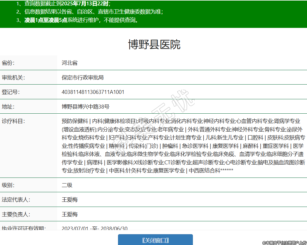省份:河北省審批機關:保定市行政審批局登記號:40381148113063711A1001地址:博野縣博興中路38號診療科目:預防保健科 | 內(nèi)科(健康體檢項目);呼吸內(nèi)科專業(yè);消化內(nèi)科專業(yè);神經(jīng)內(nèi)科專業(yè);心血管內(nèi)科專業(yè);腎病學專業(yè)(增設血液透析);內(nèi)分泌專業(yè);變態(tài)反應專業(yè);老年病專業(yè) | 外科;普通外科專業(yè);神經(jīng)外科專業(yè);骨科專業(yè);泌尿外科專業(yè);燒傷科專業(yè) | 婦產(chǎn)科;婦科專業(yè);產(chǎn)科專業(yè);計劃生育專業(yè) | 兒科;新生兒專業(yè) | 口腔科 | 皮膚科;皮膚病專業(yè);性傳播疾病專業(yè) | 精神科 | 傳染科(門診) | 腫瘤科 | 急診醫(yī)學科 | 康復醫(yī)學科 | 麻醉科 | 重癥醫(yī)學科 | 醫(yī)學檢驗科;臨床體液、血液專業(yè);臨床微生物學專業(yè);臨床化學檢驗專業(yè);臨床免疫、血清學專業(yè);臨床細胞分子遺傳學專業(yè) | 病理科 | 醫(yī)學影像科;X線診斷專業(yè);CT診斷專業(yè);超聲診斷專業(yè);心電診斷專業(yè);腦電及腦血流圖診斷專業(yè);放射治療專業(yè) | 中醫(yī)科;針灸科專業(yè);康復醫(yī)學專業(yè) | 中西醫(yī)結合科******級別:二級法定代表人:王愛梅主要負責人:王愛梅執(zhí)業(yè)許可證有效期:2023/07/01 -至- 2038/06/30 -