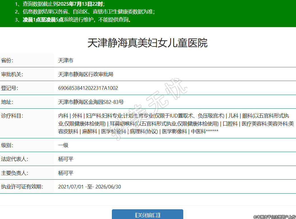 天津靜海真美婦女兒童醫(yī)院,診療科目:內(nèi)科 | 外科 | 婦產(chǎn)科;婦科專業(yè);計劃生育專業(yè)(僅限于IUD置取術(shù)、負壓吸宮術(shù)) | 兒科 | 眼科(以五官科形式執(zhí)業(yè),僅限健康體檢使用) | 耳鼻咽喉科(以五官科形式執(zhí)業(yè),僅限健康體檢使用) | 口腔科 | 醫(yī)療美容科;美容外科;美容皮膚科 | 麻醉科 | 醫(yī)學(xué)檢驗科 | 病理科(協(xié)議) | 醫(yī)學(xué)影像科 | 中醫(yī)科******