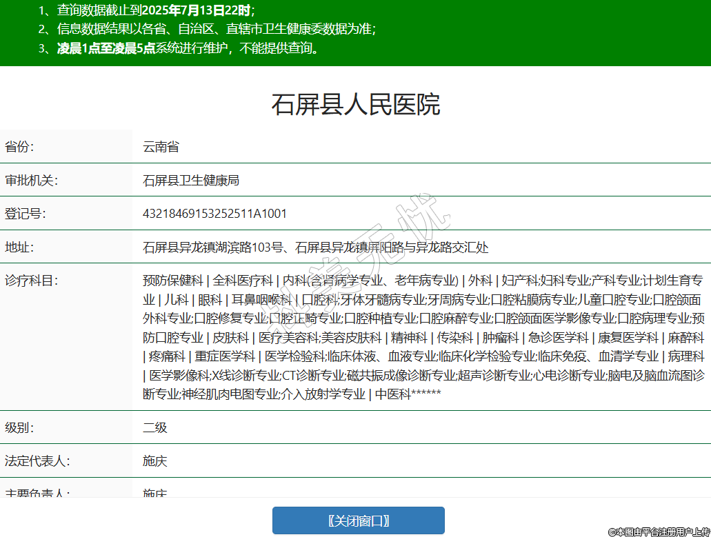 省份:云南省審批機(jī)關(guān):石屏縣衛(wèi)生健康局登記號(hào):43218469153252511A1001地址:石屏縣異龍鎮(zhèn)湖濱路103號(hào)、石屏縣異龍鎮(zhèn)屏陽路與異龍路交匯處診療科目:預(yù)防保健科 | 全科醫(yī)療科 | 內(nèi)科(含腎病學(xué)專業(yè)、老年病專業(yè)) | 外科 | 婦產(chǎn)科;婦科專業(yè);產(chǎn)科專業(yè);計(jì)劃生育專業(yè) | 兒科 | 眼科 | 耳鼻咽喉科 | 口腔科;牙體牙髓病專業(yè);牙周病專業(yè);口腔粘膜病專業(yè);兒童口腔專業(yè);口腔頜面外科專業(yè);口腔修復(fù)專業(yè);口腔正畸專業(yè);口腔種植專業(yè);口腔麻醉專業(yè);口腔頜面醫(yī)學(xué)影像專業(yè);口腔病理專業(yè);預(yù)防口腔專業(yè) | 皮膚科 | 醫(yī)療美容科;美容皮膚科 | 精神科 | 傳染科 | 腫瘤科 | 急診醫(yī)學(xué)科 | 康復(fù)醫(yī)學(xué)科 | 麻醉科 | 疼痛科 | 重癥醫(yī)學(xué)科 | 醫(yī)學(xué)檢驗(yàn)科;臨床體液、血液專業(yè);臨床化學(xué)檢驗(yàn)專業(yè);臨床免疫、血清學(xué)專業(yè) | 病理科 | 醫(yī)學(xué)影像科;X線診斷專業(yè);CT診斷專業(yè);磁共振成像診斷專業(yè);超聲診斷專業(yè);心電診斷專業(yè);腦電及腦血流圖診斷專業(yè);神經(jīng)肌肉電圖專業(yè);介入放射學(xué)專業(yè) | 中醫(yī)科******級(jí)別:二級(jí)法定代表人:施慶主要負(fù)責(zé)人:施慶執(zhí)業(yè)許可證有效期:2025/06/12 -至- 2038/11/30 -