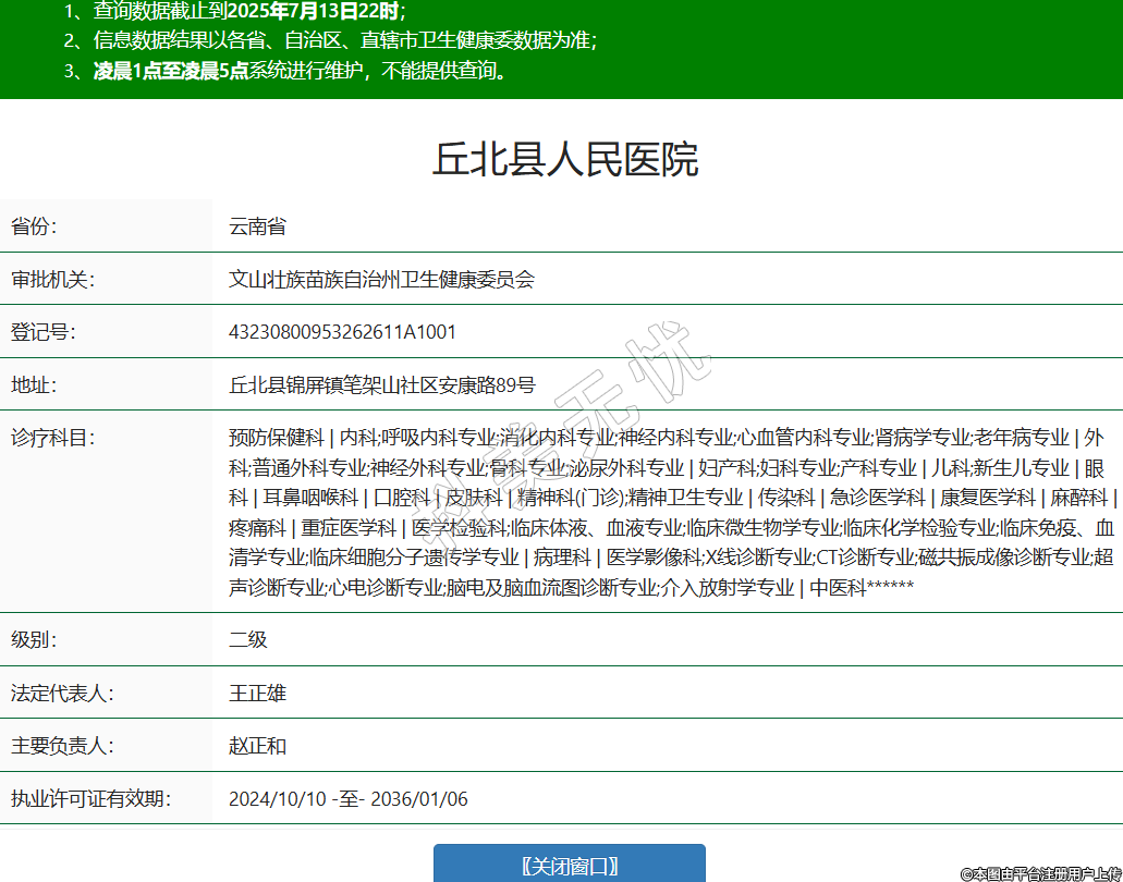 省份:云南省審批機(jī)關(guān):文山壯族苗族自治州衛(wèi)生健康委員會(huì)登記號(hào):43230800953262611A1001地址:丘北縣錦屏鎮(zhèn)筆架山社區(qū)安康路89號(hào)診療科目:預(yù)防保健科 | 內(nèi)科;呼吸內(nèi)科專(zhuān)業(yè);消化內(nèi)科專(zhuān)業(yè);神經(jīng)內(nèi)科專(zhuān)業(yè);心血管內(nèi)科專(zhuān)業(yè);腎病學(xué)專(zhuān)業(yè);老年病專(zhuān)業(yè) | 外科;普通外科專(zhuān)業(yè);神經(jīng)外科專(zhuān)業(yè);骨科專(zhuān)業(yè);泌尿外科專(zhuān)業(yè) | 婦產(chǎn)科;婦科專(zhuān)業(yè);產(chǎn)科專(zhuān)業(yè) | 兒科;新生兒專(zhuān)業(yè) | 眼科 | 耳鼻咽喉科 | 口腔科 | 皮膚科 | 精神科(門(mén)診);精神衛(wèi)生專(zhuān)業(yè) | 傳染科 | 急診醫(yī)學(xué)科 | 康復(fù)醫(yī)學(xué)科 | 麻醉科 | 疼痛科 | 重癥醫(yī)學(xué)科 | 醫(yī)學(xué)檢驗(yàn)科;臨床體液、血液專(zhuān)業(yè);臨床微生物學(xué)專(zhuān)業(yè);臨床化學(xué)檢驗(yàn)專(zhuān)業(yè);臨床免疫、血清學(xué)專(zhuān)業(yè);臨床細(xì)胞分子遺傳學(xué)專(zhuān)業(yè) | 病理科 | 醫(yī)學(xué)影像科;X線診斷專(zhuān)業(yè);CT診斷專(zhuān)業(yè);磁共振成像診斷專(zhuān)業(yè);超聲診斷專(zhuān)業(yè);心電診斷專(zhuān)業(yè);腦電及腦血流圖診斷專(zhuān)業(yè);介入放射學(xué)專(zhuān)業(yè) | 中醫(yī)科******級(jí)別:二級(jí)法定代表人:王正雄主要負(fù)責(zé)人:趙正和執(zhí)業(yè)許可證有效期:2024/10/10 -至- 2036/01/06 -