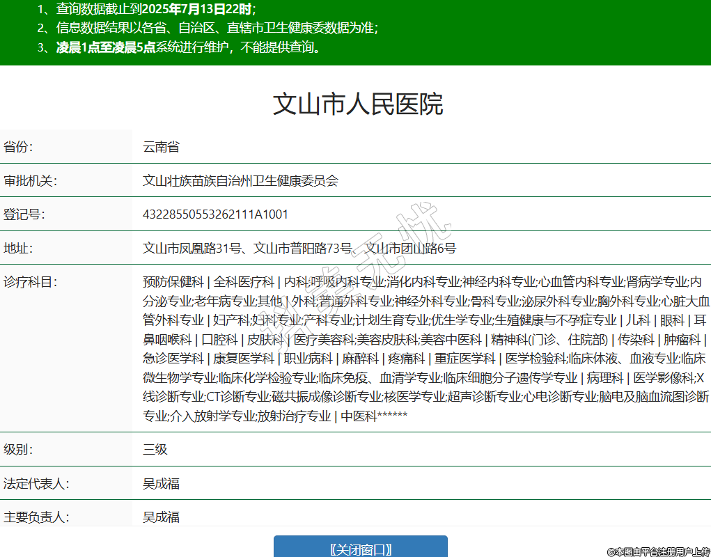 省份:云南省審批機關:文山壯族苗族自治州衛(wèi)生健康委員會登記號:43228550553262111A1001地址:文山市鳳凰路31號、文山市普陽路73號、文山市團山路6號診療科目:預防保健科 | 全科醫(yī)療科 | 內科;呼吸內科專業(yè);消化內科專業(yè);神經內科專業(yè);心血管內科專業(yè);腎病學專業(yè);內分泌專業(yè);老年病專業(yè);其他 | 外科;普通外科專業(yè);神經外科專業(yè);骨科專業(yè);泌尿外科專業(yè);胸外科專業(yè);心臟大血管外科專業(yè) | 婦產科;婦科專業(yè);產科專業(yè);計劃生育專業(yè);優(yōu)生學專業(yè);生殖健康與不孕癥專業(yè) | 兒科 | 眼科 | 耳鼻咽喉科 | 口腔科 | 皮膚科 | 醫(yī)療美容科;美容皮膚科;美容中醫(yī)科 | 精神科(門診、住院部) | 傳染科 | 腫瘤科 | 急診醫(yī)學科 | 康復醫(yī)學科 | 職業(yè)病科 | 麻醉科 | 疼痛科 | 重癥醫(yī)學科 | 醫(yī)學檢驗科;臨床體液、血液專業(yè);臨床微生物學專業(yè);臨床化學檢驗專業(yè);臨床免疫、血清學專業(yè);臨床細胞分子遺傳學專業(yè) | 病理科 | 醫(yī)學影像科;X線診斷專業(yè);CT診斷專業(yè);磁共振成像診斷專業(yè);核醫(yī)學專業(yè);超聲診斷專業(yè);心電診斷專業(yè);腦電及腦血流圖診斷專業(yè);介入放射學專業(yè);放射治療專業(yè) | 中醫(yī)科******級別:三級法定代表人:吳成福主要負責人:吳成福執(zhí)業(yè)許可證有效期:2024/12/23 -至- 2035/11/26 -