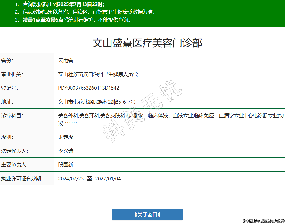 省份:云南省審批機(jī)關(guān):文山壯族苗族自治州衛(wèi)生健康委員會(huì)登記號(hào):PDY90037653260113D1542地址:文山市七花北路民族村22幢5-6-7號(hào)診療科目:美容外科;美容牙科;美容皮膚科 | 麻醉科 | 臨床體液、血液專業(yè);臨床免疫、血清學(xué)專業(yè) | 心電診斷專業(yè)(協(xié)議)******級(jí)別:未定級(jí)法定代表人:李興瑞主要負(fù)責(zé)人:段國新執(zhí)業(yè)許可證有效期:2024/07/25 -至- 2027/01/04 -