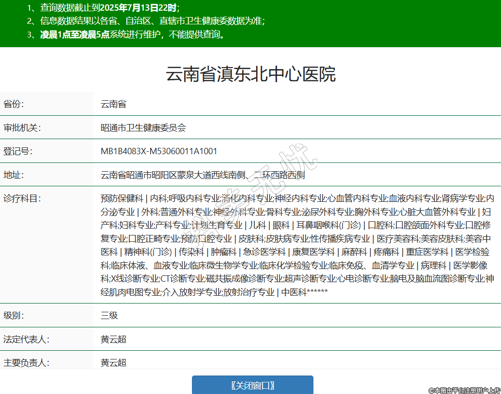 省份:云南省審批機(jī)關(guān):昭通市衛(wèi)生健康委員會(huì)登記號(hào):MB1B4083X-M53060011A1001地址:云南省昭通市昭陽區(qū)蒙泉大道西線南側(cè)、二環(huán)西路西側(cè)診療科目:預(yù)防保健科 | 內(nèi)科;呼吸內(nèi)科專業(yè);消化內(nèi)科專業(yè);神經(jīng)內(nèi)科專業(yè);心血管內(nèi)科專業(yè);血液內(nèi)科專業(yè);腎病學(xué)專業(yè);內(nèi)分泌專業(yè) | 外科;普通外科專業(yè);神經(jīng)外科專業(yè);骨科專業(yè);泌尿外科專業(yè);胸外科專業(yè);心臟大血管外科專業(yè) | 婦產(chǎn)科;婦科專業(yè);產(chǎn)科專業(yè);計(jì)劃生育專業(yè) | 兒科 | 眼科 | 耳鼻咽喉科(門診) | 口腔科;口腔頜面外科專業(yè);口腔修復(fù)專業(yè);口腔正畸專業(yè);預(yù)防口腔專業(yè) | 皮膚科;皮膚病專業(yè);性傳播疾病專業(yè) | 醫(yī)療美容科;美容皮膚科;美容中醫(yī)科 | 精神科(門診) | 傳染科 | 腫瘤科 | 急診醫(yī)學(xué)科 | 康復(fù)醫(yī)學(xué)科 | 麻醉科 | 疼痛科 | 重癥醫(yī)學(xué)科 | 醫(yī)學(xué)檢驗(yàn)科;臨床體液、血液專業(yè);臨床微生物學(xué)專業(yè);臨床化學(xué)檢驗(yàn)專業(yè);臨床免疫、血清學(xué)專業(yè) | 病理科 | 醫(yī)學(xué)影像科;X線診斷專業(yè);CT診斷專業(yè);磁共振成像診斷專業(yè);超聲診斷專業(yè);心電診斷專業(yè);腦電及腦血流圖診斷專業(yè);神經(jīng)肌肉電圖專業(yè);介入放射學(xué)專業(yè);放射治療專業(yè) | 中醫(yī)科******級(jí)別:三級(jí)法定代表人:黃云超主要負(fù)責(zé)人:黃云超執(zhí)業(yè)許可證有效期:2024/11/10 -至- 2039/11/09 -