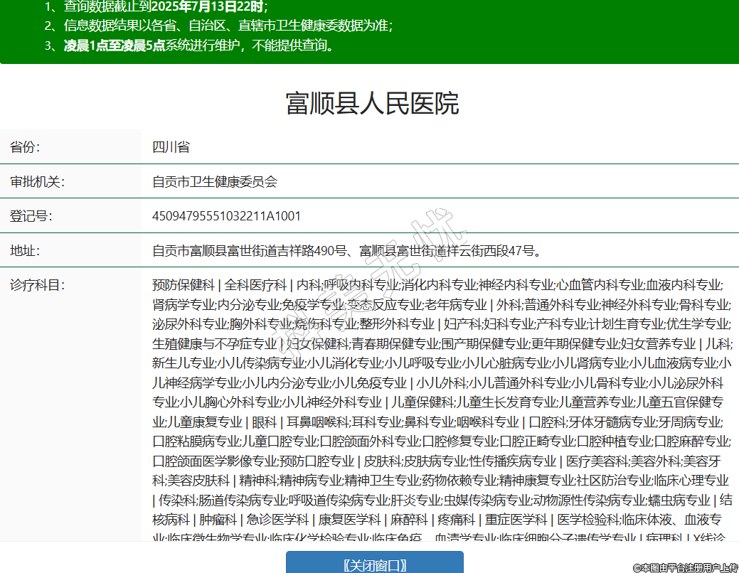 省份:四川省審批機(jī)關(guān):自貢市衛(wèi)生健康委員會登記號:45094795551032211A1001地址:自貢市富順縣富世街道吉祥路490號、富順縣富世街道祥云街西段47號。診療科目:預(yù)防保健科 | 全科醫(yī)療科 | 內(nèi)科;呼吸內(nèi)科專業(yè);消化內(nèi)科專業(yè);神經(jīng)內(nèi)科專業(yè);心血管內(nèi)科專業(yè);血液內(nèi)科專業(yè);腎病學(xué)專業(yè);內(nèi)分泌專業(yè);免疫學(xué)專業(yè);變態(tài)反應(yīng)專業(yè);老年病專業(yè) | 外科;普通外科專業(yè);神經(jīng)外科專業(yè);骨科專業(yè);泌尿外科專業(yè);胸外科專業(yè);燒傷科專業(yè);整形外科專業(yè) | 婦產(chǎn)科;婦科專業(yè);產(chǎn)科專業(yè);計(jì)劃生育專業(yè);優(yōu)生學(xué)專業(yè);生殖健康與不孕癥專業(yè) | 婦女保健科;青春期保健專業(yè);圍產(chǎn)期保健專業(yè);更年期保健專業(yè);婦女營養(yǎng)專業(yè) | 兒科;新生兒專業(yè);小兒傳染病專業(yè);小兒消化專業(yè);小兒呼吸專業(yè);小兒心臟病專業(yè);小兒腎病專業(yè);小兒血液病專業(yè);小兒神經(jīng)病學(xué)專業(yè);小兒內(nèi)分泌專業(yè);小兒免疫專業(yè) | 小兒外科;小兒普通外科專業(yè);小兒骨科專業(yè);小兒泌尿外科專業(yè);小兒胸心外科專業(yè);小兒神經(jīng)外科專業(yè) | 兒童保健科;兒童生長發(fā)育專業(yè);兒童營養(yǎng)專業(yè);兒童五官保健專業(yè);兒童康復(fù)專業(yè) | 眼科 | 耳鼻咽喉科;耳科專業(yè);鼻科專業(yè);咽喉科專業(yè) | 口腔科;牙體牙髓病專業(yè);牙周病專業(yè);口腔粘膜病專業(yè);兒童口腔專業(yè);口腔頜面外科專業(yè);口腔修復(fù)專業(yè);口腔正畸專業(yè);口腔種植專業(yè);口腔麻醉專業(yè);口腔頜面醫(yī)學(xué)影像專業(yè);預(yù)防口腔專業(yè) | 皮膚科;皮膚病專業(yè);性傳播疾病專業(yè) | 醫(yī)療美容科;美容外科;美容牙科;美容皮膚科 | 精神科;精神病專業(yè);精神衛(wèi)生專業(yè);藥物依賴專業(yè);精神康復(fù)專業(yè);社區(qū)防治專業(yè);臨床心理專業(yè) | 傳染科;腸道傳染病專業(yè);呼吸道傳染病專業(yè);肝炎專業(yè);蟲媒傳染病專業(yè);動物源性傳染病專業(yè);蠕蟲病專業(yè) | 結(jié)核病科 | 腫瘤科 | 急診醫(yī)學(xué)科 | 康復(fù)醫(yī)學(xué)科 | 麻醉科 | 疼痛科 | 重癥醫(yī)學(xué)科 | 醫(yī)學(xué)檢驗(yàn)科;臨床體液、血液專業(yè);臨床微生物學(xué)專業(yè);臨床化學(xué)檢驗(yàn)專業(yè);臨床免疫、血清學(xué)專業(yè);臨床細(xì)胞分子遺傳學(xué)專業(yè) | 病理科 | X線診斷專業(yè);CT診斷專業(yè);磁共振成像診斷專業(yè);超聲診斷專業(yè);心電診斷專業(yè);腦電及腦血流圖診斷專業(yè);神經(jīng)肌肉電圖專業(yè);介入放射學(xué)專業(yè);放射治療專業(yè) | 中醫(yī)科;內(nèi)科專業(yè);外科專業(yè);婦產(chǎn)科專業(yè);兒科專業(yè);皮膚科專業(yè);腫瘤科專業(yè);骨傷科專業(yè);肛腸科專業(yè);老年病科專業(yè);針灸科專業(yè);推拿科專業(yè);康復(fù)醫(yī)學(xué)專業(yè);預(yù)防保健科專業(yè) | 中西醫(yī)結(jié)合科******級別:三級法定代表人:高凌燕主要負(fù)責(zé)人:高凌燕執(zhí)業(yè)許可證有效期:2012/12/28 -至- 2027/12/27 -
