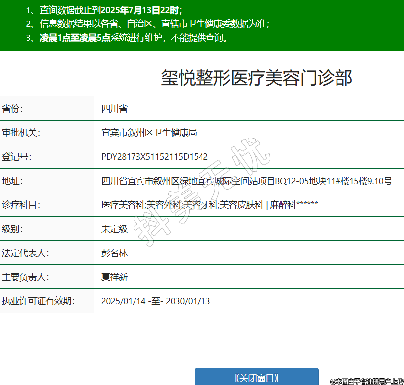省份:四川省審批機(jī)關(guān):宜賓市敘州區(qū)衛(wèi)生健康局登記號(hào):PDY28173X51152115D1542地址:四川省宜賓市敘州區(qū)綠地宜賓城際空間站項(xiàng)目BQ12-05地塊11#樓15樓9.10號(hào)診療科目:醫(yī)療美容科;美容外科;美容牙科;美容皮膚科 | 麻醉科******級(jí)別:未定級(jí)法定代表人:彭名林主要負(fù)責(zé)人:夏祥新執(zhí)業(yè)許可證有效期:2025/01/14 -至- 2030/01/13 -