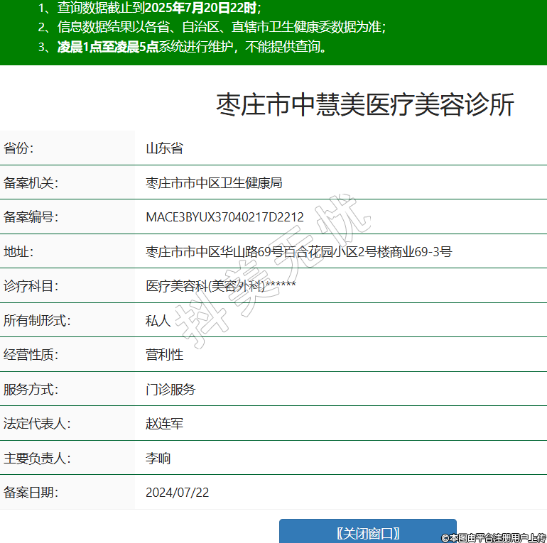 省份:山東省備案機(jī)關(guān):棗莊市市中區(qū)衛(wèi)生健康局備案編號:MACE3BYUX37040217D2212地址:棗莊市市中區(qū)華山路69號百合花園小區(qū)2號樓商業(yè)69-3號診療科目:醫(yī)療美容科(美容外科)******所有制形式:私人經(jīng)營性質(zhì):營利性服務(wù)方式:門診服務(wù)法定代表人:趙連軍主要負(fù)責(zé)人:李響備案日期:2024/07/22 -