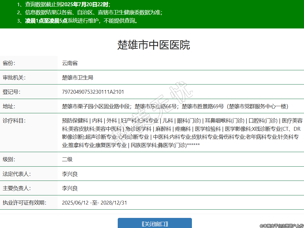 省份:云南省審批機關:楚雄市衛(wèi)生局登記號:79720490753230111A2101地址:楚雄市栗子園小區(qū)固業(yè)路中段;楚雄市東山路66號;楚雄市勝景路69號(楚雄市黨群服務中心一樓)診療科目:預防保健科 | 內(nèi)科 | 外科 | 婦產(chǎn)科;婦科專業(yè) | 兒科 | 眼科(門診) | 耳鼻咽喉科(門診) | 口腔科(門診) | 醫(yī)療美容科;美容皮膚科;美容中醫(yī)科 | 急診醫(yī)學科 | 麻醉科 | 疼痛科 | 醫(yī)學檢驗科 | 醫(yī)學影像科;X線診斷專業(yè)(CT、DR影像診斷);超聲診斷專業(yè);心電診斷專業(yè) | 中醫(yī)科;內(nèi)科專業(yè);皮膚科專業(yè);骨傷科專業(yè);老年病科專業(yè);針灸科專業(yè);推拿科專業(yè);康復醫(yī)學專業(yè) | 民族醫(yī)學科;彝醫(yī)學(門診)******級別:二級法定代表人:李興良主要負責人:李興良執(zhí)業(yè)許可證有效期:2025/06/12 -至- 2028/12/31 -