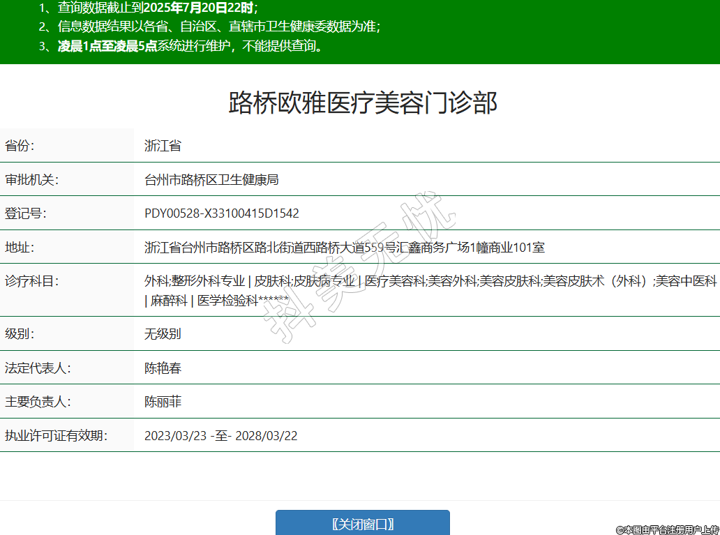 省份:浙江省審批機(jī)關(guān):臺(tái)州市路橋區(qū)衛(wèi)生健康局登記號(hào):PDY00528-X33100415D1542地址:浙江省臺(tái)州市路橋區(qū)路北街道西路橋大道559號(hào)匯鑫商務(wù)廣場(chǎng)1幢商業(yè)101室診療科目:外科;整形外科專(zhuān)業(yè) | 皮膚科;皮膚病專(zhuān)業(yè) | 醫(yī)療美容科;美容外科;美容皮膚科;美容皮膚術(shù)(外科);美容中醫(yī)科 | 麻醉科 | 醫(yī)學(xué)檢驗(yàn)科******級(jí)別:無(wú)級(jí)別法定代表人:陳艷春主要負(fù)責(zé)人:陳麗菲執(zhí)業(yè)許可證有效期:2023/03/23 -至- 2028/03/22 -