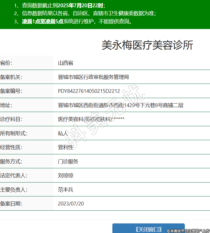 省份:山西省備案機(jī)關(guān):晉城市城區(qū)行政審批服務(wù)管理局備案編號(hào):PDY84227614050215D2212地址:晉城市城區(qū)西街街道新市西街1429號(hào)下元巷8號(hào)商鋪二層診療科目:醫(yī)療美容科(美容皮膚科)******所有制形式:私人經(jīng)營(yíng)性質(zhì):營(yíng)利性服務(wù)方式:門診服務(wù)法定代表人:劉瓊瓊主要負(fù)責(zé)人:范豐兵備案日期:2023/07/20 -