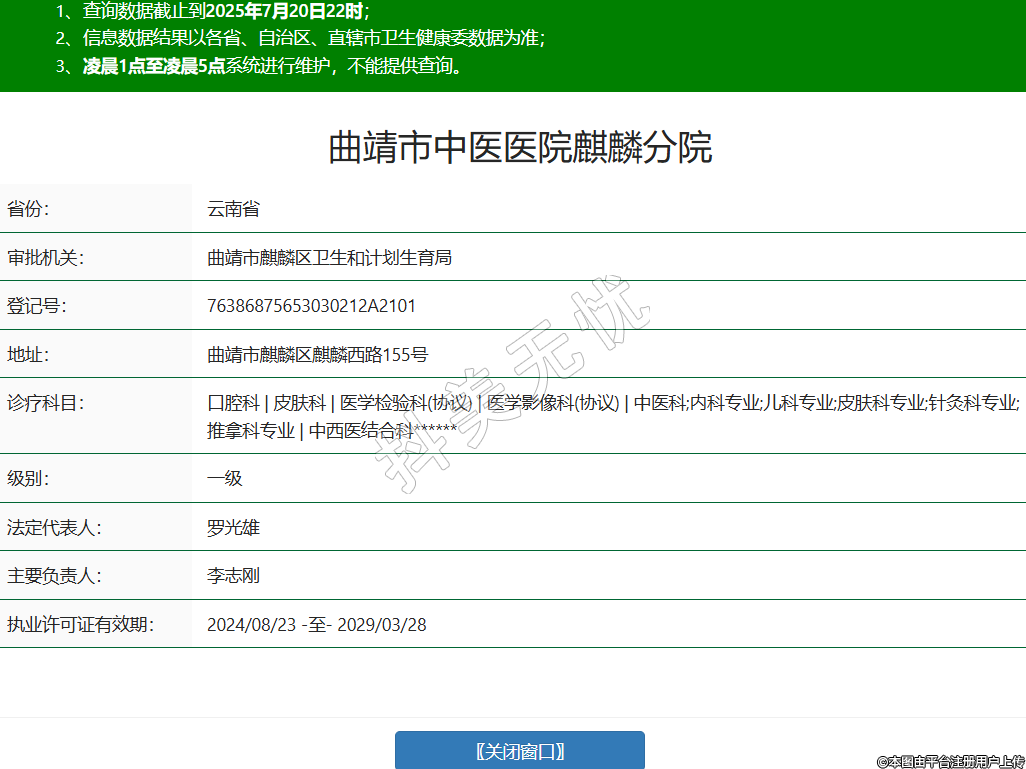 曲靖市中醫(yī)醫(yī)院麒麟分院,診療科目:口腔科 | 皮膚科 | 醫(yī)學(xué)檢驗(yàn)科(協(xié)議) | 醫(yī)學(xué)影像科(協(xié)議) | 中醫(yī)科;內(nèi)科專業(yè);兒科專業(yè);皮膚科專業(yè);針灸科專業(yè);推拿科專業(yè) | 中西醫(yī)結(jié)合科******