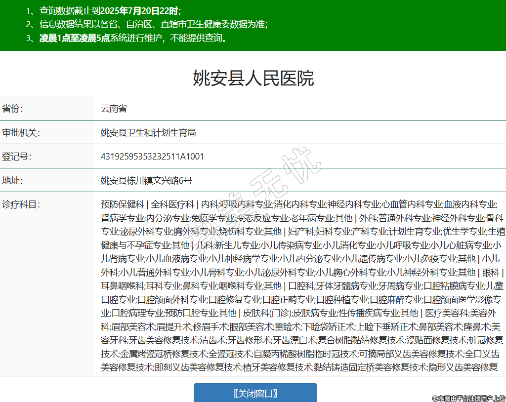 省份:云南省審批機關(guān):姚安縣衛(wèi)生和計劃生育局登記號:43192595353232511A1001地址:姚安縣棟川鎮(zhèn)文興路6號診療科目:預(yù)防保健科 | 全科醫(yī)療科 | 內(nèi)科;呼吸內(nèi)科專業(yè);消化內(nèi)科專業(yè);神經(jīng)內(nèi)科專業(yè);心血管內(nèi)科專業(yè);血液內(nèi)科專業(yè);腎病學(xué)專業(yè);內(nèi)分泌專業(yè);免疫學(xué)專業(yè);變態(tài)反應(yīng)專業(yè);老年病專業(yè);其他 | 外科;普通外科專業(yè);神經(jīng)外科專業(yè);骨科專業(yè);泌尿外科專業(yè);胸外科專業(yè);燒傷科專業(yè);其他 | 婦產(chǎn)科;婦科專業(yè);產(chǎn)科專業(yè);計劃生育專業(yè);優(yōu)生學(xué)專業(yè);生殖健康與不孕癥專業(yè);其他 | 兒科;新生兒專業(yè);小兒傳染病專業(yè);小兒消化專業(yè);小兒呼吸專業(yè);小兒心臟病專業(yè);小兒腎病專業(yè);小兒血液病專業(yè);小兒神經(jīng)病學(xué)專業(yè);小兒內(nèi)分泌專業(yè);小兒遺傳病專業(yè);小兒免疫專業(yè);其他 | 小兒外科;小兒普通外科專業(yè);小兒骨科專業(yè);小兒泌尿外科專業(yè);小兒胸心外科專業(yè);小兒神經(jīng)外科專業(yè);其他 | 眼科 | 耳鼻咽喉科;耳科專業(yè);鼻科專業(yè);咽喉科專業(yè);其他 | 口腔科;牙體牙髓病專業(yè);牙周病專業(yè);口腔粘膜病專業(yè);兒童口腔專業(yè);口腔頜面外科專業(yè);口腔修復(fù)專業(yè);口腔正畸專業(yè);口腔種植專業(yè);口腔麻醉專業(yè);口腔頜面醫(yī)學(xué)影像專業(yè);口腔病理專業(yè);預(yù)防口腔專業(yè);其他 | 皮膚科(門診);皮膚病專業(yè);性傳播疾病專業(yè);其他 | 醫(yī)療美容科;美容外科;眉部美容術(shù);眉提升術(shù);修眉手術(shù);眼部美容術(shù);重瞼術(shù);下瞼袋矯正術(shù);上瞼下垂矯正術(shù);鼻部美容術(shù);隆鼻術(shù);美容牙科;牙齒美容修復(fù)技術(shù);潔齒術(shù);牙齒修形術(shù);牙齒漂白術(shù);復(fù)合樹脂黏結(jié)修復(fù)技術(shù);瓷貼面修復(fù)技術(shù);樁冠修復(fù)技術(shù);金屬烤瓷冠橋修復(fù)技術(shù);全瓷冠技術(shù);自凝丙稀酸樹脂臨時冠技術(shù);可摘局部義齒美容修復(fù)技術(shù);全口義齒美容修復(fù)技術(shù);即刻義齒美容修復(fù)技術(shù);植牙美容修復(fù)技術(shù);黏結(jié)鑄造固定橋美容修復(fù)技術(shù);隱形義齒美容修復(fù)技術(shù);套筒冠義齒美容修復(fù)技術(shù);牙齦切除術(shù);牙齦成形術(shù);牙冠延長術(shù);牙槽骨修整術(shù);牙槽骨嵴修整術(shù);牙頜畸形美容矯治技術(shù);機械性活動性矯治器矯治技術(shù);功能性矯治器矯治技術(shù);固定矯治技術(shù);美容皮膚科;診斷技術(shù);真菌鏡檢技術(shù);皮膚活檢術(shù);治療技術(shù);皮膚腫物切除術(shù);拔甲術(shù);腋臭手術(shù);火針術(shù);中藥外治;激光美容治療術(shù);高頻電美容治療;脫毛術(shù);注射美容技術(shù);A型肉毒毒素美容注射技術(shù);文眉技術(shù);文眼線技術(shù);文唇技術(shù);不良文飾修復(fù)技術(shù) | 精神科;精神病專業(yè);精神衛(wèi)生專業(yè);藥物依賴專業(yè);臨床心理專業(yè);其他 | 傳染科;腸道傳染病專業(yè);呼吸道傳染病專業(yè);肝炎專業(yè);蟲媒傳染病專業(yè);動物源性傳染病專業(yè);蠕蟲病專業(yè);其他 | 結(jié)核病科 | 地方病科 | 腫瘤科 | 急診醫(yī)學(xué)科 | 康復(fù)醫(yī)學(xué)科 | 塵肺專業(yè) | 麻醉科 | 疼痛科 | 重癥醫(yī)學(xué)科 | 醫(yī)學(xué)檢驗科;臨床體液、血液專業(yè);臨床微生物學(xué)專業(yè);臨床化學(xué)檢驗專業(yè);臨床免疫、血清學(xué)專業(yè);臨床細(xì)胞分子遺傳學(xué)專業(yè);其他 | 病理科 | 醫(yī)學(xué)影像科;X線診斷專業(yè);CT診斷專業(yè);磁共振成像診斷專業(yè);超聲診斷專業(yè);心電診斷專業(yè);腦電及腦血流圖診斷專業(yè);神經(jīng)肌肉電圖專業(yè);介入放射學(xué)專業(yè);放射治療專業(yè);其他 | 中醫(yī)科;內(nèi)科專業(yè);外科專業(yè);婦產(chǎn)科專業(yè);兒科專業(yè);皮膚科專業(yè);眼科專業(yè);耳鼻咽喉科專業(yè);口腔科專業(yè);腫瘤科專業(yè);骨傷科專業(yè);肛腸科專業(yè);老年病科專業(yè);針灸科專業(yè);推拿科專業(yè);康復(fù)醫(yī)學(xué)專業(yè);急診科專業(yè);預(yù)防保健科專業(yè);其他 | 彝醫(yī)學(xué)******級別:二級法定代表人:代有禮主要負(fù)責(zé)人:代有禮執(zhí)業(yè)許可證有效期:2025/06/24 -至- 2037/11/14 -