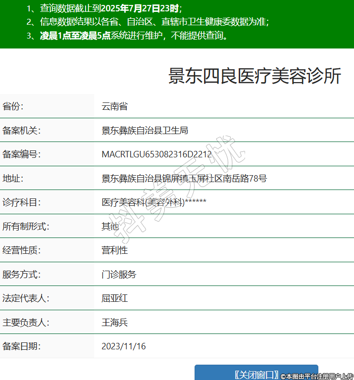 省份:云南省備案機(jī)關(guān):景東彝族自治縣衛(wèi)生局備案編號(hào):MACRTLGU653082316D2212地址:景東彝族自治縣錦屏鎮(zhèn)玉屏社區(qū)南岳路78號(hào)診療科目:醫(yī)療美容科(美容外科)******所有制形式:其他經(jīng)營(yíng)性質(zhì):營(yíng)利性服務(wù)方式:門診服務(wù)法定代表人:屈亞紅主要負(fù)責(zé)人:王海兵備案日期:2023/11/16 -