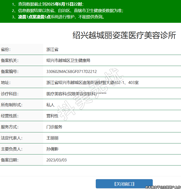 省份:浙江省備案機(jī)關(guān):紹興市越城區(qū)衛(wèi)生健康局備案編號(hào):330602MAC68GF0717D2212地址:浙江省紹興市越城區(qū)迪蕩街道財(cái)智大廈402-1、403室診療科目:醫(yī)療美容科(僅限美容皮膚科)******所有制形式:私人經(jīng)營(yíng)性質(zhì):營(yíng)利性服務(wù)方式:門診服務(wù)法定代表人:王麗麗主要負(fù)責(zé)人:孫倩影備案日期:2023/03/03 -