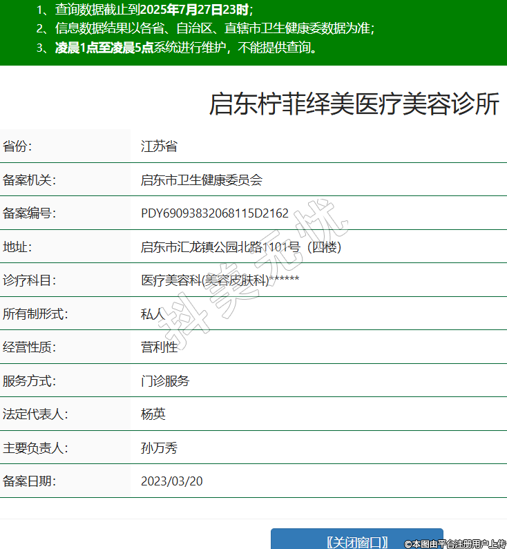省份:江蘇省備案機(jī)關(guān):啟東市衛(wèi)生健康委員會備案編號:PDY69093832068115D2162地址:啟東市匯龍鎮(zhèn)公園北路1101號(四樓)診療科目:醫(yī)療美容科(美容皮膚科)******所有制形式:私人經(jīng)營性質(zhì):營利性服務(wù)方式:門診服務(wù)法定代表人:楊英主要負(fù)責(zé)人:孫萬秀備案日期:2023/03/20 -
