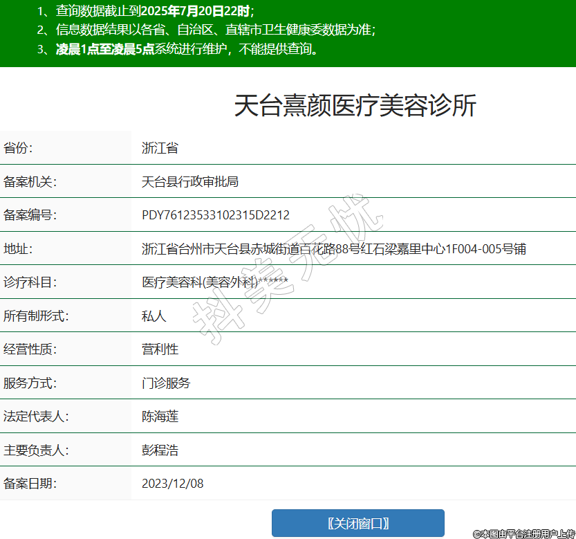 省份:浙江省備案機(jī)關(guān):天臺(tái)縣行政審批局備案編號(hào):PDY76123533102315D2212地址:浙江省臺(tái)州市天臺(tái)縣赤城街道百花路88號(hào)紅石梁嘉里中心1F004-005號(hào)鋪診療科目:醫(yī)療美容科(美容外科)******所有制形式:私人經(jīng)營(yíng)性質(zhì):營(yíng)利性服務(wù)方式:門(mén)診服務(wù)法定代表人:陳海蓮主要負(fù)責(zé)人:彭程浩備案日期:2023/12/08 -