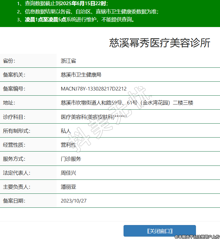 省份:浙江省備案機(jī)關(guān):慈溪市衛(wèi)生健康局備案編號(hào):MACNJ78Y-133028217D2212地址:慈溪市坎墩街道人和路59號(hào)、61號(hào)(金水灣花園)二樓三樓診療科目:醫(yī)療美容科(美容皮膚科)******所有制形式:私人經(jīng)營(yíng)性質(zhì):營(yíng)利性服務(wù)方式:門(mén)診服務(wù)法定代表人:周佳興主要負(fù)責(zé)人:潘麗亞備案日期:2023/10/27 -
