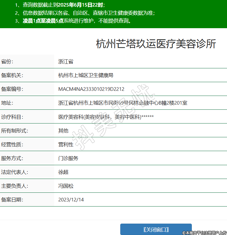 省份:浙江省備案機(jī)關(guān):杭州市上城區(qū)衛(wèi)生健康局備案編號:MACM4NA2333010219D2212地址:浙江省杭州市上城區(qū)市民街69號民林金融中心B幢2樓201室診療科目:醫(yī)療美容科(美容皮膚科,美容中醫(yī)科)******所有制形式:其他經(jīng)營性質(zhì):營利性服務(wù)方式:門診服務(wù)法定代表人:徐超主要負(fù)責(zé)人:馮國松備案日期:2023/12/14 -