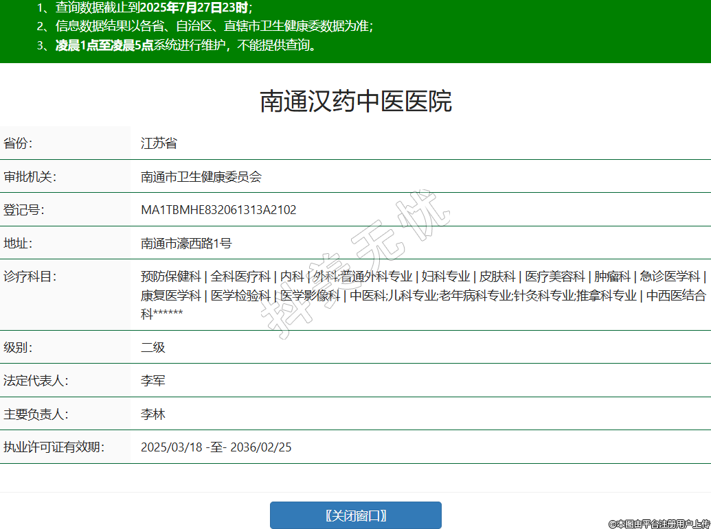 省份:江蘇省審批機關(guān):南通市衛(wèi)生健康委員會登記號:MA1TBMHE832061313A2102地址:南通市濠西路1號診療科目:預(yù)防保健科 | 全科醫(yī)療科 | 內(nèi)科 | 外科;普通外科專業(yè) | 婦科專業(yè) | 皮膚科 | 醫(yī)療美容科 | 腫瘤科 | 急診醫(yī)學(xué)科 | 康復(fù)醫(yī)學(xué)科 | 醫(yī)學(xué)檢驗科 | 醫(yī)學(xué)影像科 | 中醫(yī)科;兒科專業(yè);老年病科專業(yè);針灸科專業(yè);推拿科專業(yè) | 中西醫(yī)結(jié)合科******級別:二級法定代表人:李軍主要負責(zé)人:李林執(zhí)業(yè)許可證有效期:2025/03/18 -至- 2036/02/25 -