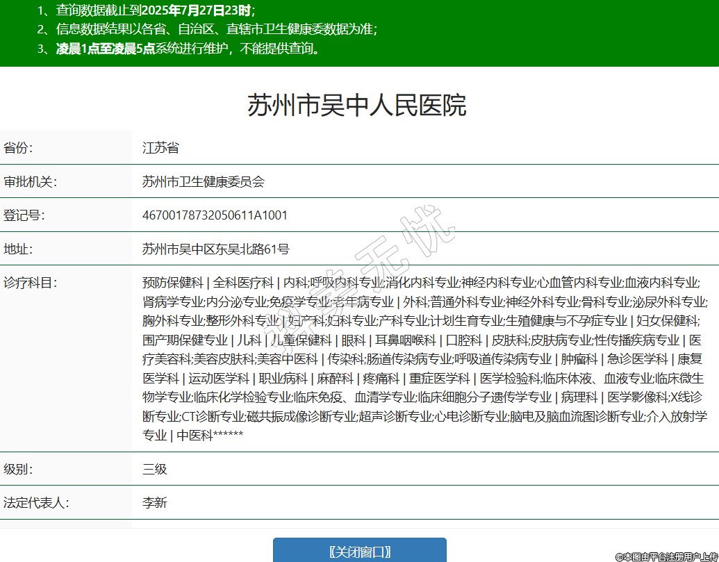 省份:江蘇省審批機(jī)關(guān):蘇州市衛(wèi)生健康委員會(huì)登記號(hào):46700178732050611A1001地址:蘇州市吳中區(qū)東吳北路61號(hào)診療科目:預(yù)防保健科 | 全科醫(yī)療科 | 內(nèi)科;呼吸內(nèi)科專業(yè);消化內(nèi)科專業(yè);神經(jīng)內(nèi)科專業(yè);心血管內(nèi)科專業(yè);血液內(nèi)科專業(yè);腎病學(xué)專業(yè);內(nèi)分泌專業(yè);免疫學(xué)專業(yè);老年病專業(yè) | 外科;普通外科專業(yè);神經(jīng)外科專業(yè);骨科專業(yè);泌尿外科專業(yè);胸外科專業(yè);整形外科專業(yè) | 婦產(chǎn)科;婦科專業(yè);產(chǎn)科專業(yè);計(jì)劃生育專業(yè);生殖健康與不孕癥專業(yè) | 婦女保健科;圍產(chǎn)期保健專業(yè) | 兒科 | 兒童保健科 | 眼科 | 耳鼻咽喉科 | 口腔科 | 皮膚科;皮膚病專業(yè);性傳播疾病專業(yè) | 醫(yī)療美容科;美容皮膚科;美容中醫(yī)科 | 傳染科;腸道傳染病專業(yè);呼吸道傳染病專業(yè) | 腫瘤科 | 急診醫(yī)學(xué)科 | 康復(fù)醫(yī)學(xué)科 | 運(yùn)動(dòng)醫(yī)學(xué)科 | 職業(yè)病科 | 麻醉科 | 疼痛科 | 重癥醫(yī)學(xué)科 | 醫(yī)學(xué)檢驗(yàn)科;臨床體液、血液專業(yè);臨床微生物學(xué)專業(yè);臨床化學(xué)檢驗(yàn)專業(yè);臨床免疫、血清學(xué)專業(yè);臨床細(xì)胞分子遺傳學(xué)專業(yè) | 病理科 | 醫(yī)學(xué)影像科;X線診斷專業(yè);CT診斷專業(yè);磁共振成像診斷專業(yè);超聲診斷專業(yè);心電診斷專業(yè);腦電及腦血流圖診斷專業(yè);介入放射學(xué)專業(yè) | 中醫(yī)科******級(jí)別:三級(jí)法定代表人:李新主要負(fù)責(zé)人:李新執(zhí)業(yè)許可證有效期:2025/07/03 -至- 2033/05/21 -