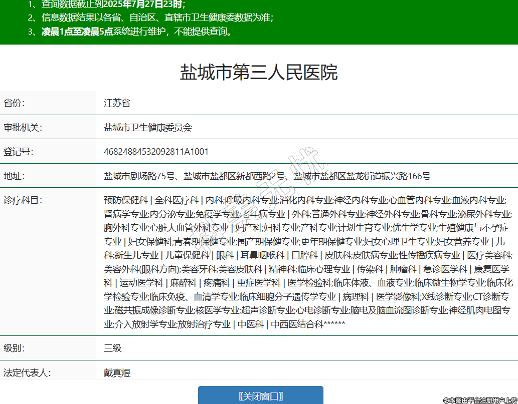 省份:江蘇省審批機(jī)關(guān):鹽城市衛(wèi)生健康委員會(huì)登記號(hào):46824884532092811A1001地址:鹽城市劇場(chǎng)路75號(hào)、鹽城市鹽都區(qū)新都西路2號(hào)、鹽城市鹽都區(qū)鹽龍街道振興路166號(hào)診療科目:預(yù)防保健科 | 全科醫(yī)療科 | 內(nèi)科;呼吸內(nèi)科專(zhuān)業(yè);消化內(nèi)科專(zhuān)業(yè);神經(jīng)內(nèi)科專(zhuān)業(yè);心血管內(nèi)科專(zhuān)業(yè);血液內(nèi)科專(zhuān)業(yè);腎病學(xué)專(zhuān)業(yè);內(nèi)分泌專(zhuān)業(yè);免疫學(xué)專(zhuān)業(yè);老年病專(zhuān)業(yè) | 外科;普通外科專(zhuān)業(yè);神經(jīng)外科專(zhuān)業(yè);骨科專(zhuān)業(yè);泌尿外科專(zhuān)業(yè);胸外科專(zhuān)業(yè);心臟大血管外科專(zhuān)業(yè) | 婦產(chǎn)科;婦科專(zhuān)業(yè);產(chǎn)科專(zhuān)業(yè);計(jì)劃生育專(zhuān)業(yè);優(yōu)生學(xué)專(zhuān)業(yè);生殖健康與不孕癥專(zhuān)業(yè) | 婦女保健科;青春期保健專(zhuān)業(yè);圍產(chǎn)期保健專(zhuān)業(yè);更年期保健專(zhuān)業(yè);婦女心理衛(wèi)生專(zhuān)業(yè);婦女營(yíng)養(yǎng)專(zhuān)業(yè) | 兒科;新生兒專(zhuān)業(yè) | 兒童保健科 | 眼科 | 耳鼻咽喉科 | 口腔科 | 皮膚科;皮膚病專(zhuān)業(yè);性傳播疾病專(zhuān)業(yè) | 醫(yī)療美容科;美容外科(眼科方向);美容牙科;美容皮膚科 | 精神科;臨床心理專(zhuān)業(yè) | 傳染科 | 腫瘤科 | 急診醫(yī)學(xué)科 | 康復(fù)醫(yī)學(xué)科 | 運(yùn)動(dòng)醫(yī)學(xué)科 | 麻醉科 | 疼痛科 | 重癥醫(yī)學(xué)科 | 醫(yī)學(xué)檢驗(yàn)科;臨床體液、血液專(zhuān)業(yè);臨床微生物學(xué)專(zhuān)業(yè);臨床化學(xué)檢驗(yàn)專(zhuān)業(yè);臨床免疫、血清學(xué)專(zhuān)業(yè);臨床細(xì)胞分子遺傳學(xué)專(zhuān)業(yè) | 病理科 | 醫(yī)學(xué)影像科;X線診斷專(zhuān)業(yè);CT診斷專(zhuān)業(yè);磁共振成像診斷專(zhuān)業(yè);核醫(yī)學(xué)專(zhuān)業(yè);超聲診斷專(zhuān)業(yè);心電診斷專(zhuān)業(yè);腦電及腦血流圖診斷專(zhuān)業(yè);神經(jīng)肌肉電圖專(zhuān)業(yè);介入放射學(xué)專(zhuān)業(yè);放射治療專(zhuān)業(yè) | 中醫(yī)科 | 中西醫(yī)結(jié)合科******級(jí)別:三級(jí)法定代表人:戴真煜主要負(fù)責(zé)人:戴真煜執(zhí)業(yè)許可證有效期:2021/12/18 -至- 2036/12/18 -