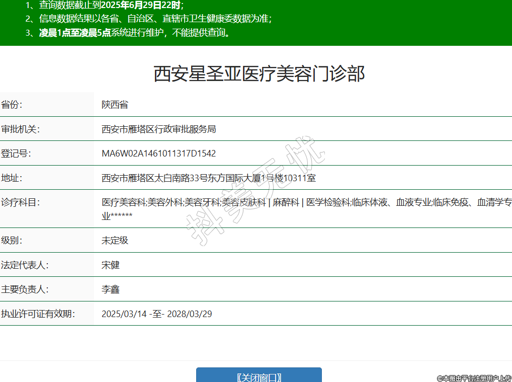 省份:陜西省審批機關:西安市雁塔區(qū)行政審批服務局登記號:MA6W02A1461011317D1542地址:西安市雁塔區(qū)太白南路33號東方國際大廈1號樓10311室診療科目:醫(yī)療美容科;美容外科;美容牙科;美容皮膚科 | 麻醉科 | 醫(yī)學檢驗科;臨床體液、血液專業(yè);臨床免疫、血清學專業(yè)******級別:未定級法定代表人:宋健主要負責人:李鑫執(zhí)業(yè)許可證有效期:2025/03/14 -至- 2028/03/29 -