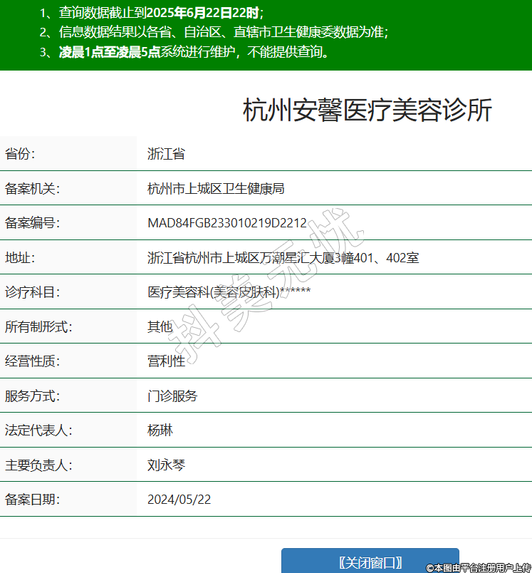 省份:浙江省備案機(jī)關(guān):杭州市上城區(qū)衛(wèi)生健康局備案編號(hào):MAD84FGB233010219D2212地址:浙江省杭州市上城區(qū)萬潮星匯大廈3幢401、402室診療科目:醫(yī)療美容科(美容皮膚科)******所有制形式:其他經(jīng)營(yíng)性質(zhì):營(yíng)利性服務(wù)方式:門診服務(wù)法定代表人:楊琳主要負(fù)責(zé)人:劉永琴備案日期:2024/05/22 -