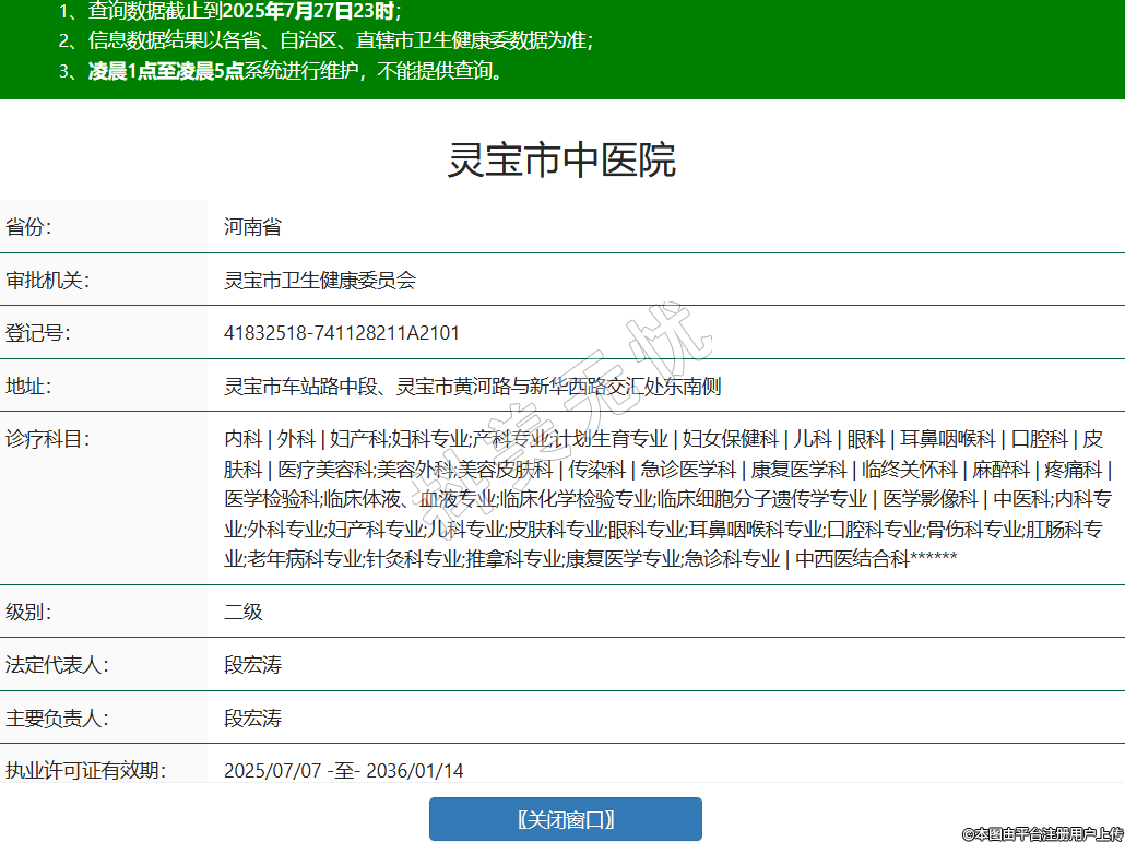 省份:河南省審批機(jī)關(guān):靈寶市衛(wèi)生健康委員會(huì)登記號(hào):41832518-741128211A2101地址:靈寶市車(chē)站路中段、靈寶市黃河路與新華西路交匯處東南側(cè)診療科目:內(nèi)科 | 外科 | 婦產(chǎn)科;婦科專(zhuān)業(yè);產(chǎn)科專(zhuān)業(yè);計(jì)劃生育專(zhuān)業(yè) | 婦女保健科 | 兒科 | 眼科 | 耳鼻咽喉科 | 口腔科 | 皮膚科 | 醫(yī)療美容科;美容外科;美容皮膚科 | 傳染科 | 急診醫(yī)學(xué)科 | 康復(fù)醫(yī)學(xué)科 | 臨終關(guān)懷科 | 麻醉科 | 疼痛科 | 醫(yī)學(xué)檢驗(yàn)科;臨床體液、血液專(zhuān)業(yè);臨床化學(xué)檢驗(yàn)專(zhuān)業(yè);臨床細(xì)胞分子遺傳學(xué)專(zhuān)業(yè) | 醫(yī)學(xué)影像科 | 中醫(yī)科;內(nèi)科專(zhuān)業(yè);外科專(zhuān)業(yè);婦產(chǎn)科專(zhuān)業(yè);兒科專(zhuān)業(yè);皮膚科專(zhuān)業(yè);眼科專(zhuān)業(yè);耳鼻咽喉科專(zhuān)業(yè);口腔科專(zhuān)業(yè);骨傷科專(zhuān)業(yè);肛腸科專(zhuān)業(yè);老年病科專(zhuān)業(yè);針灸科專(zhuān)業(yè);推拿科專(zhuān)業(yè);康復(fù)醫(yī)學(xué)專(zhuān)業(yè);急診科專(zhuān)業(yè) | 中西醫(yī)結(jié)合科******級(jí)別:二級(jí)法定代表人:段宏濤主要負(fù)責(zé)人:段宏濤執(zhí)業(yè)許可證有效期:2025/07/07 -至- 2036/01/14 -