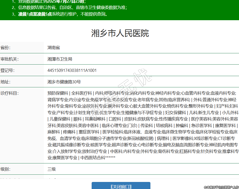 省份:湖南省審批機(jī)關(guān):湘潭市衛(wèi)生局登記號(hào):44515091743038111A1001地址:湘鄉(xiāng)市健康路30號(hào)診療科目:預(yù)防保健科 | 全科醫(yī)療科 | 內(nèi)科;呼吸內(nèi)科專業(yè);消化內(nèi)科專業(yè);神經(jīng)內(nèi)科專業(yè);心血管內(nèi)科專業(yè);血液內(nèi)科專業(yè);腎病學(xué)專業(yè);內(nèi)分泌專業(yè);免疫學(xué)專業(yè);變態(tài)反應(yīng)專業(yè);老年病專業(yè);其他(臨床營(yíng)養(yǎng)科) | 外科;普通外科專業(yè);神經(jīng)外科專業(yè);骨科專業(yè);泌尿外科專業(yè);胸外科專業(yè);心臟大血管外科專業(yè);燒傷科專業(yè);整形外科專業(yè) | 婦產(chǎn)科;婦科專業(yè);產(chǎn)科專業(yè);計(jì)劃生育專業(yè);優(yōu)生學(xué)專業(yè);生殖健康與不孕癥專業(yè) | 婦女保健科 | 兒科;新生兒專業(yè) | 小兒外科 | 兒童保健科 | 眼科 | 耳鼻咽喉科 | 口腔科 | 皮膚科;皮膚病專業(yè);性傳播疾病專業(yè) | 醫(yī)療美容科;美容外科;美容牙科;美容皮膚科;美容中醫(yī)科 | 臨床心理專業(yè)(門(mén)診) | 傳染科 | 結(jié)核病科 | 腫瘤科 | 急診醫(yī)學(xué)科 | 康復(fù)醫(yī)學(xué)科 | 麻醉科 | 疼痛科 | 重癥醫(yī)學(xué)科 | 醫(yī)學(xué)檢驗(yàn)科;臨床體液、血液專業(yè);臨床微生物學(xué)專業(yè);臨床化學(xué)檢驗(yàn)專業(yè);臨床免疫、血清學(xué)專業(yè);臨床細(xì)胞分子遺傳學(xué)專業(yè)(新冠核酸檢測(cè)) | 病理科 | 醫(yī)學(xué)影像科;X線診斷專業(yè);CT診斷專業(yè);磁共振成像診斷專業(yè);核醫(yī)學(xué)專業(yè);超聲診斷專業(yè);心電診斷專業(yè);腦電及腦血流圖診斷專業(yè);神經(jīng)肌肉電圖專業(yè);介入放射學(xué)專業(yè);放射治療專業(yè) | 中醫(yī)科;內(nèi)科專業(yè);外科專業(yè);骨傷科專業(yè);肛腸科專業(yè);針灸科專業(yè);推拿科專業(yè);康復(fù)醫(yī)學(xué)專業(yè) | 中西醫(yī)結(jié)合科******級(jí)別:三級(jí)法定代表人:李昕陽(yáng)主要負(fù)責(zé)人:李昕陽(yáng)執(zhí)業(yè)許可證有效期:2024/07/09 -至- 2037/11/29 -