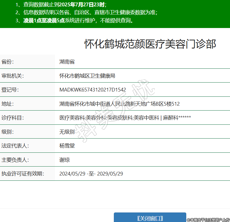 省份:湖南省審批機(jī)關(guān):懷化市鶴城區(qū)衛(wèi)生健康局登記號(hào):MADKWK65743120217D1542地址:湖南省懷化市城中街道人民北路新天地廣場(chǎng)B區(qū)5樓512診療科目:醫(yī)療美容科;美容外科;美容皮膚科;美容中醫(yī)科 | 麻醉科******級(jí)別:無級(jí)別法定代表人:楊雪堂主要負(fù)責(zé)人:謝瓊執(zhí)業(yè)許可證有效期:2024/05/29 -至- 2029/05/29 -