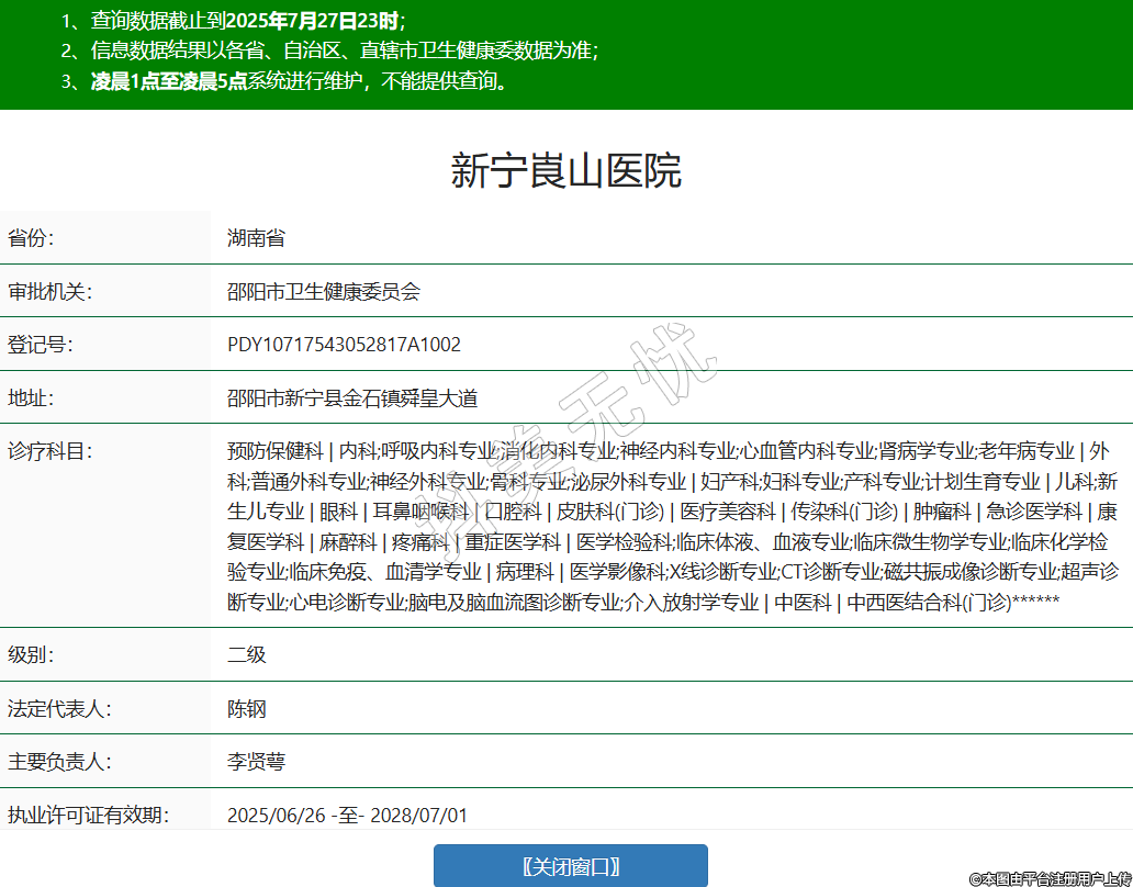 省份:湖南省審批機關(guān):邵陽市衛(wèi)生健康委員會登記號:PDY10717543052817A1002地址:邵陽市新寧縣金石鎮(zhèn)舜皇大道診療科目:預(yù)防保健科 | 內(nèi)科;呼吸內(nèi)科專業(yè);消化內(nèi)科專業(yè);神經(jīng)內(nèi)科專業(yè);心血管內(nèi)科專業(yè);腎病學(xué)專業(yè);老年病專業(yè) | 外科;普通外科專業(yè);神經(jīng)外科專業(yè);骨科專業(yè);泌尿外科專業(yè) | 婦產(chǎn)科;婦科專業(yè);產(chǎn)科專業(yè);計劃生育專業(yè) | 兒科;新生兒專業(yè) | 眼科 | 耳鼻咽喉科 | 口腔科 | 皮膚科(門診) | 醫(yī)療美容科 | 傳染科(門診) | 腫瘤科 | 急診醫(yī)學(xué)科 | 康復(fù)醫(yī)學(xué)科 | 麻醉科 | 疼痛科 | 重癥醫(yī)學(xué)科 | 醫(yī)學(xué)檢驗科;臨床體液、血液專業(yè);臨床微生物學(xué)專業(yè);臨床化學(xué)檢驗專業(yè);臨床免疫、血清學(xué)專業(yè) | 病理科 | 醫(yī)學(xué)影像科;X線診斷專業(yè);CT診斷專業(yè);磁共振成像診斷專業(yè);超聲診斷專業(yè);心電診斷專業(yè);腦電及腦血流圖診斷專業(yè);介入放射學(xué)專業(yè) | 中醫(yī)科 | 中西醫(yī)結(jié)合科(門診)******級別:二級法定代表人:陳鋼主要負責(zé)人:李賢萼 -