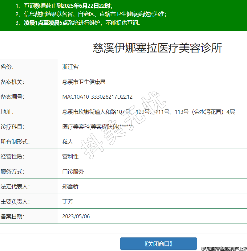 省份:浙江省備案機關(guān):慈溪市衛(wèi)生健康局備案編號:MAC10A10-333028217D2212地址:慈溪市坎墩街道人和路107號、109號、111號、113號(金水灣花園)4層診療科目:醫(yī)療美容科(美容皮膚科)******所有制形式:私人經(jīng)營性質(zhì):營利性服務(wù)方式:門診服務(wù)法定代表人:鄭雪驕主要負(fù)責(zé)人:丁芳備案日期:2023/05/06 -