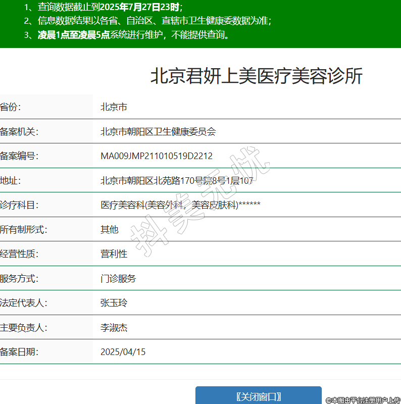 省份:北京市備案機(jī)關(guān):北京市朝陽(yáng)區(qū)衛(wèi)生健康委員會(huì)備案編號(hào):MA009JMP211010519D2212地址:北京市朝陽(yáng)區(qū)北苑路170號(hào)院8號(hào)1層107診療科目:醫(yī)療美容科(美容外科,美容皮膚科)******所有制形式:其他經(jīng)營(yíng)性質(zhì):營(yíng)利性服務(wù)方式:門診服務(wù)法定代表人:張玉玲主要負(fù)責(zé)人:李淑杰備案日期:2025/04/15 -