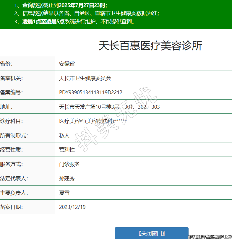 省份:安徽省備案機(jī)關(guān):天長(zhǎng)市衛(wèi)生健康委員會(huì)備案編號(hào):PDY93905134118119D2212地址:天長(zhǎng)市天發(fā)廣場(chǎng)10號(hào)樓3層、301、302、303診療科目:醫(yī)療美容科(美容皮膚科)******所有制形式:私人經(jīng)營(yíng)性質(zhì):營(yíng)利性服務(wù)方式:門診服務(wù)法定代表人:孫建秀主要負(fù)責(zé)人:夏雪備案日期:2023/12/19 -