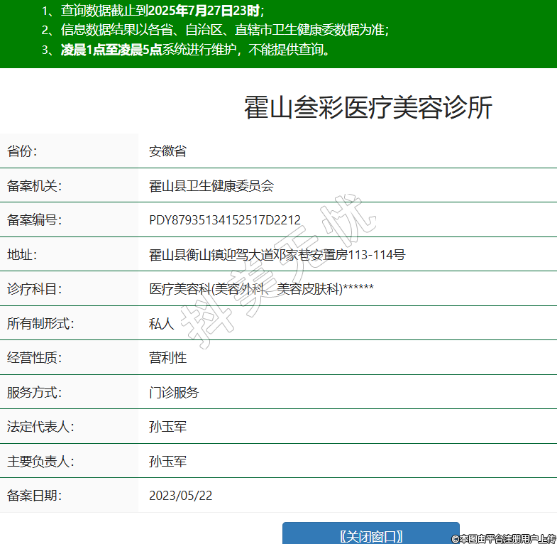 省份:安徽省備案機(jī)關(guān):霍山縣衛(wèi)生健康委員會(huì)備案編號(hào):PDY87935134152517D2212地址:霍山縣衡山鎮(zhèn)迎駕大道鄧家巷安置房113-114號(hào)診療科目:醫(yī)療美容科(美容外科、美容皮膚科)******所有制形式:私人經(jīng)營(yíng)性質(zhì):營(yíng)利性服務(wù)方式:門診服務(wù)法定代表人:孫玉軍主要負(fù)責(zé)人:孫玉軍備案日期:2023/05/22 -