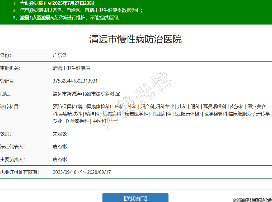 省份:廣東省審批機關(guān):清遠(yuǎn)市衛(wèi)生健康局登記號:375828441802313931地址:清遠(yuǎn)市新城連江路(市法院斜對面)診療科目:預(yù)防保健科(增加健康體檢科) | 內(nèi)科 | 外科 | 婦產(chǎn)科;婦科專業(yè) | 兒科 | 眼科 | 耳鼻咽喉科 | 皮膚科 | 醫(yī)療美容科;美容皮膚科 | 精神科 | 結(jié)核病科 | 康復(fù)醫(yī)學(xué)科 | 職業(yè)病科(職業(yè)健康體檢) | 醫(yī)學(xué)檢驗科;臨床細(xì)胞分子遺傳學(xué)專業(yè) | 醫(yī)學(xué)影像科 | 中醫(yī)科******級別:未定級法定代表人:唐杰彬主要負(fù)責(zé)人:唐杰彬執(zhí)業(yè)許可證有效期:2023/09/18 -至- 2028/09/17 -