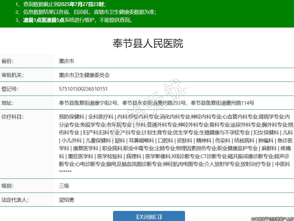 省份:重慶市審批機關(guān):重慶市衛(wèi)生健康委員會登記號:575101500236510151地址:奉節(jié)縣魚復(fù)街道康寧街2號、奉節(jié)縣永安街道夔州路293號、奉節(jié)縣魚復(fù)街道夔州路114號診療科目:預(yù)防保健科 | 全科醫(yī)療科 | 內(nèi)科;呼吸內(nèi)科專業(yè);消化內(nèi)科專業(yè);神經(jīng)內(nèi)科專業(yè);心血管內(nèi)科專業(yè);腎病學(xué)專業(yè);內(nèi)分泌專業(yè);免疫學(xué)專業(yè);老年病專業(yè) | 外科;普通外科專業(yè);神經(jīng)外科專業(yè);骨科專業(yè);泌尿外科專業(yè);胸外科專業(yè);燒傷科專業(yè) | 婦產(chǎn)科;婦科專業(yè);產(chǎn)科專業(yè);計劃生育專業(yè);優(yōu)生學(xué)專業(yè);生殖健康與不孕癥專業(yè) | 婦女保健科 | 兒科 | 小兒外科 | 兒童保健科 | 眼科 | 耳鼻咽喉科 | 口腔科 | 皮膚科 | 精神科 | 傳染科 | 結(jié)核病科 | 腫瘤科 | 急診醫(yī)學(xué)科 | 康復(fù)醫(yī)學(xué)科 | 職業(yè)病科;職業(yè)中毒專業(yè);塵肺專業(yè);物理因素損傷專業(yè);職業(yè)健康監(jiān)護專業(yè) | 麻醉科 | 疼痛科 | 重癥醫(yī)學(xué)科 | 醫(yī)學(xué)檢驗科 | 病理科 | 醫(yī)學(xué)影像科;X線診斷專業(yè);CT診斷專業(yè);磁共振成像診斷專業(yè);超聲診斷專業(yè);心電診斷專業(yè);腦電及腦血流圖診斷專業(yè);神經(jīng)肌肉電圖專業(yè);介入放射學(xué)專業(yè);放射治療專業(yè) | 中醫(yī)科******級別:三級法定代表人:梁紹勇主要負責(zé)人:劉其輝執(zhí)業(yè)許可證有效期:2016/06/29 -至- 2031/06/28 -