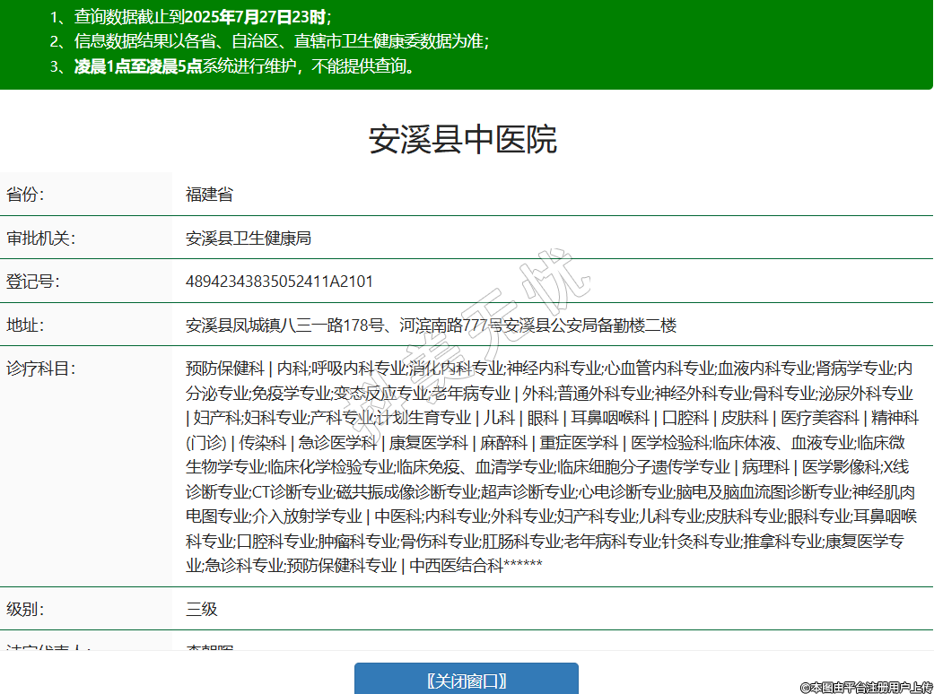 省份:福建省審批機(jī)關(guān):安溪縣衛(wèi)生健康局登記號:48942343835052411A2101地址:安溪縣鳳城鎮(zhèn)八三一路178號、河濱南路777號安溪縣公安局備勤樓二樓診療科目:預(yù)防保健科 | 內(nèi)科;呼吸內(nèi)科專業(yè);消化內(nèi)科專業(yè);神經(jīng)內(nèi)科專業(yè);心血管內(nèi)科專業(yè);血液內(nèi)科專業(yè);腎病學(xué)專業(yè);內(nèi)分泌專業(yè);免疫學(xué)專業(yè);變態(tài)反應(yīng)專業(yè);老年病專業(yè) | 外科;普通外科專業(yè);神經(jīng)外科專業(yè);骨科專業(yè);泌尿外科專業(yè) | 婦產(chǎn)科;婦科專業(yè);產(chǎn)科專業(yè);計劃生育專業(yè) | 兒科 | 眼科 | 耳鼻咽喉科 | 口腔科 | 皮膚科 | 醫(yī)療美容科 | 精神科(門診) | 傳染科 | 急診醫(yī)學(xué)科 | 康復(fù)醫(yī)學(xué)科 | 麻醉科 | 重癥醫(yī)學(xué)科 | 醫(yī)學(xué)檢驗科;臨床體液、血液專業(yè);臨床微生物學(xué)專業(yè);臨床化學(xué)檢驗專業(yè);臨床免疫、血清學(xué)專業(yè);臨床細(xì)胞分子遺傳學(xué)專業(yè) | 病理科 | 醫(yī)學(xué)影像科;X線診斷專業(yè);CT診斷專業(yè);磁共振成像診斷專業(yè);超聲診斷專業(yè);心電診斷專業(yè);腦電及腦血流圖診斷專業(yè);神經(jīng)肌肉電圖專業(yè);介入放射學(xué)專業(yè) | 中醫(yī)科;內(nèi)科專業(yè);外科專業(yè);婦產(chǎn)科專業(yè);兒科專業(yè);皮膚科專業(yè);眼科專業(yè);耳鼻咽喉科專業(yè);口腔科專業(yè);腫瘤科專業(yè);骨傷科專業(yè);肛腸科專業(yè);老年病科專業(yè);針灸科專業(yè);推拿科專業(yè);康復(fù)醫(yī)學(xué)專業(yè);急診科專業(yè);預(yù)防保健科專業(yè) | 中西醫(yī)結(jié)合科******級別:三級法定代表人:李朝暉主要負(fù)責(zé)人:李朝暉執(zhí)業(yè)許可證有效期:2022/10/01 -至- 2028/09/30 -