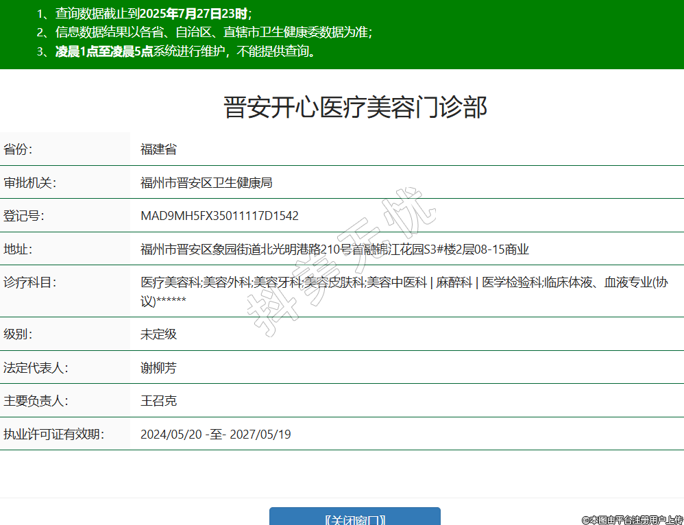 省份:福建省審批機(jī)關(guān):福州市晉安區(qū)衛(wèi)生健康局登記號(hào):MAD9MH5FX35011117D1542地址:福州市晉安區(qū)象園街道北光明港路210號(hào)首融錦江花園S3#樓2層08-15商業(yè)診療科目:醫(yī)療美容科;美容外科;美容牙科;美容皮膚科;美容中醫(yī)科 | 麻醉科 | 醫(yī)學(xué)檢驗(yàn)科;臨床體液、血液專業(yè)(協(xié)議)******級(jí)別:未定級(jí)法定代表人:謝柳芳主要負(fù)責(zé)人:王召克執(zhí)業(yè)許可證有效期:2024/05/20 -至- 2027/05/19 -