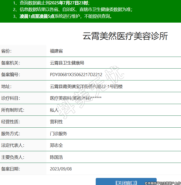 省份:福建省備案機(jī)關(guān):云霄縣衛(wèi)生健康局備案編號(hào):PDY00681X35062217D2212地址:云霄縣莆美鎮(zhèn)寶洋街僑興路22-1號(hào)四樓診療科目:醫(yī)療美容科(美容外科)******所有制形式:私人經(jīng)營(yíng)性質(zhì):營(yíng)利性服務(wù)方式:門(mén)診服務(wù)法定代表人:鄭志全主要負(fù)責(zé)人:陳國(guó)浩備案日期:2023/09/08 -